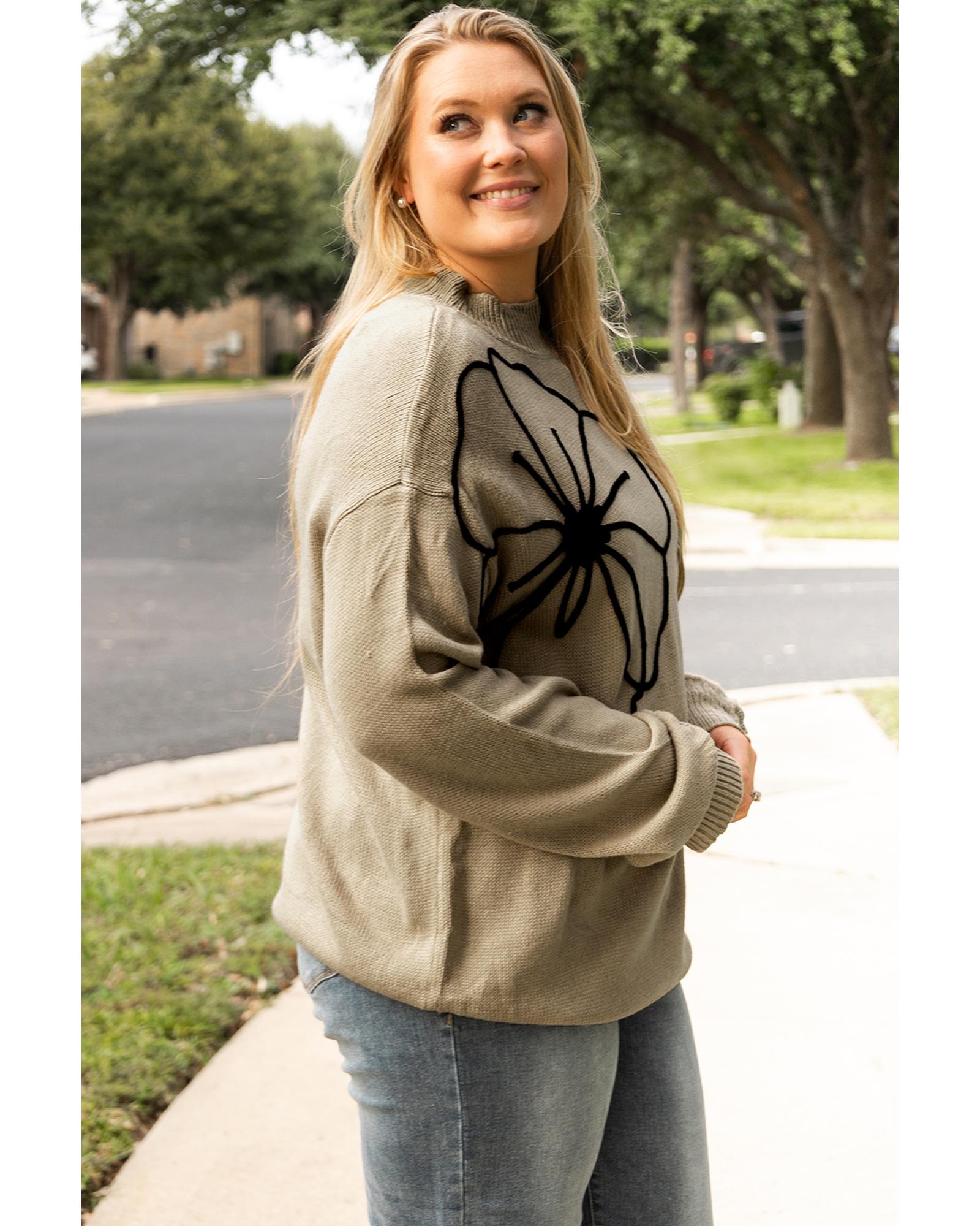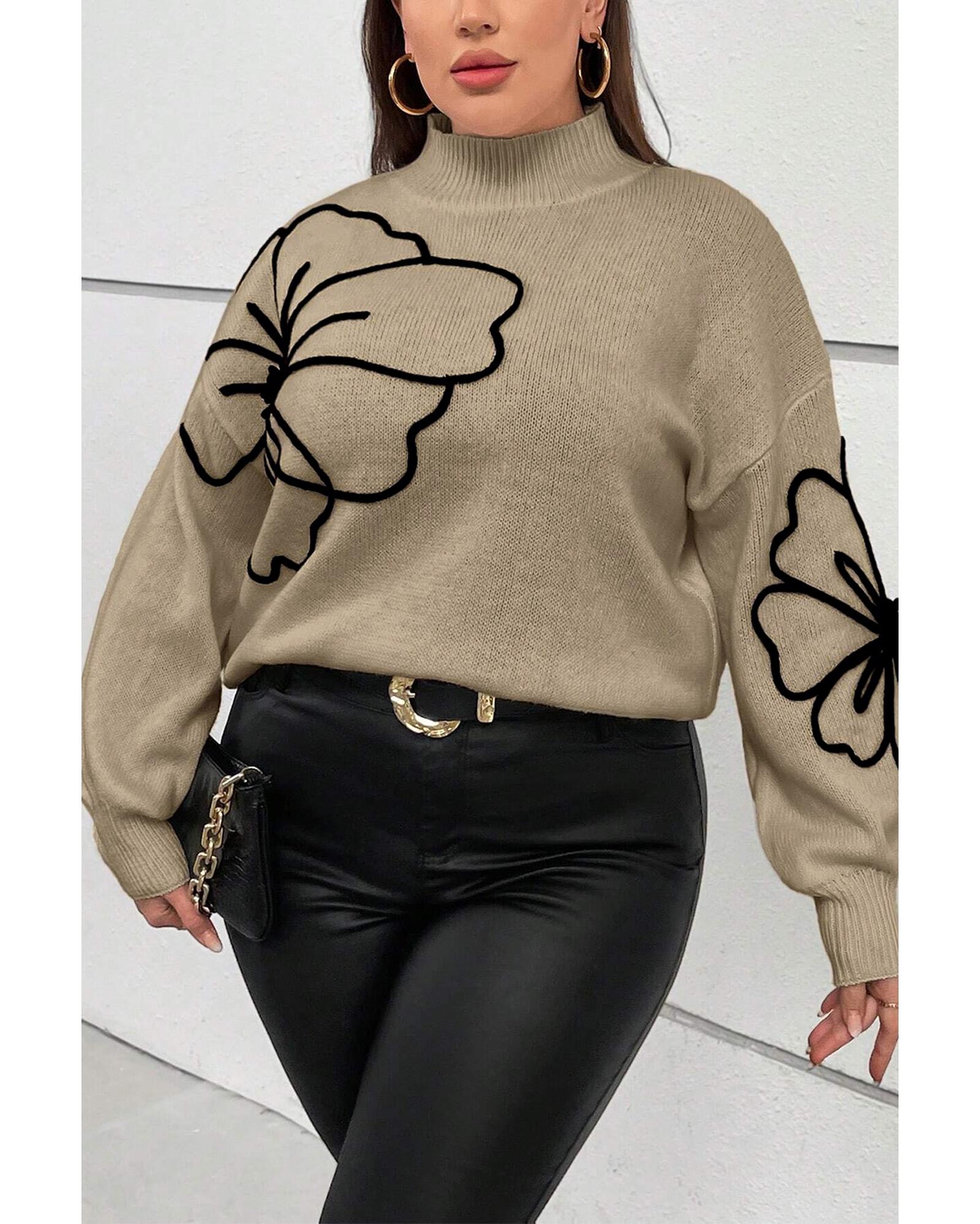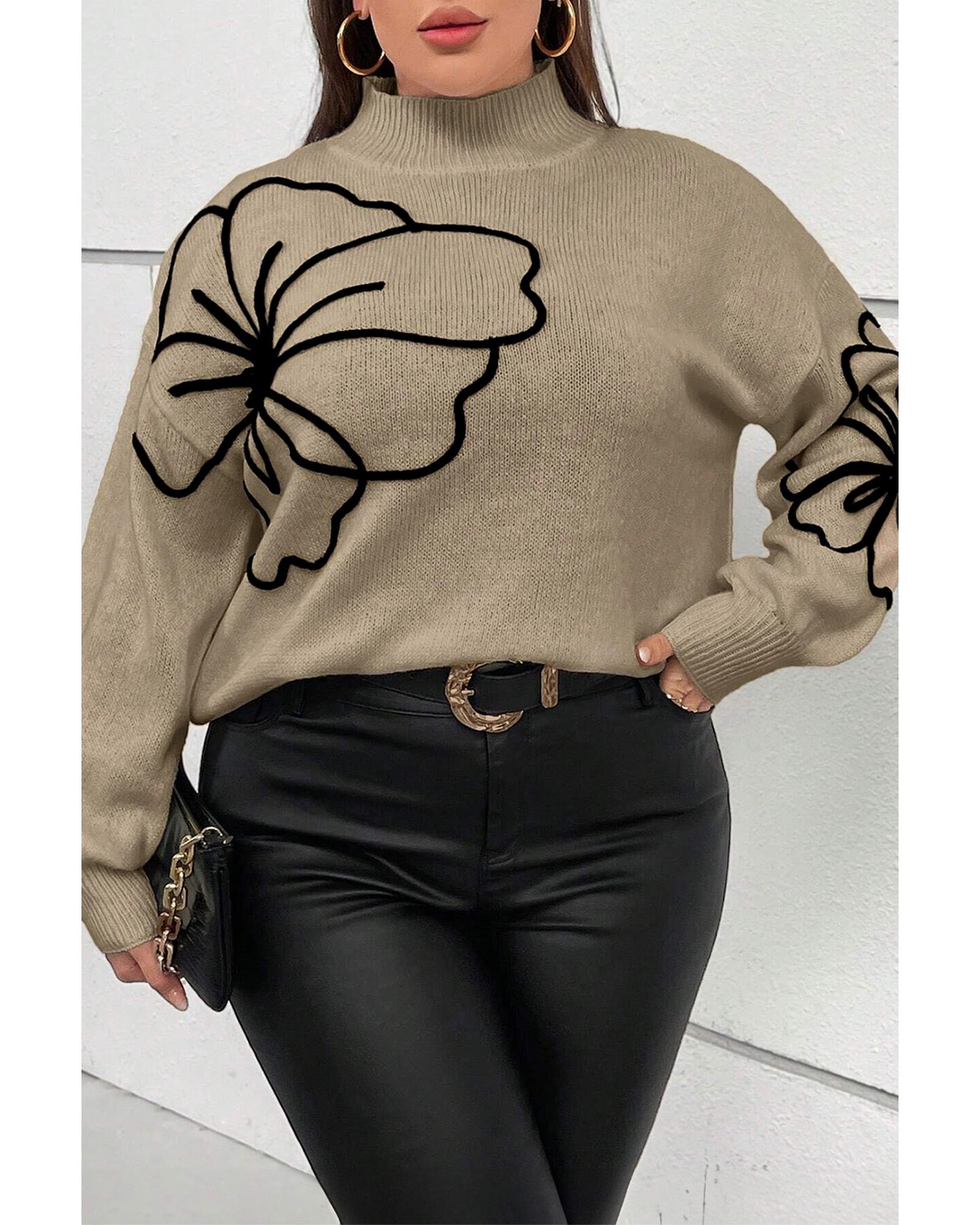 Dark Khaki Plus Size Big Flower Pattern High Neck Drop Shoulder Sweater – 4X