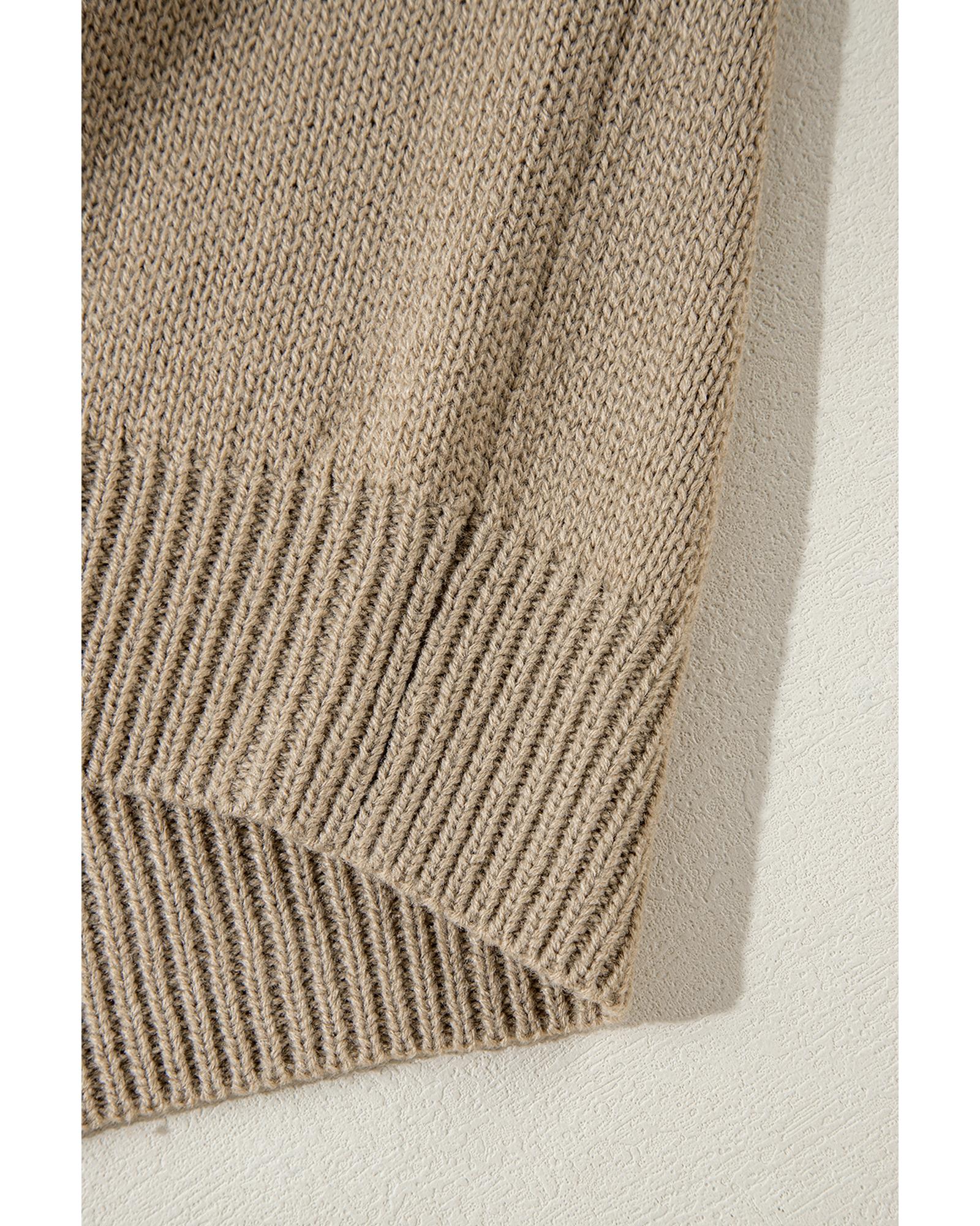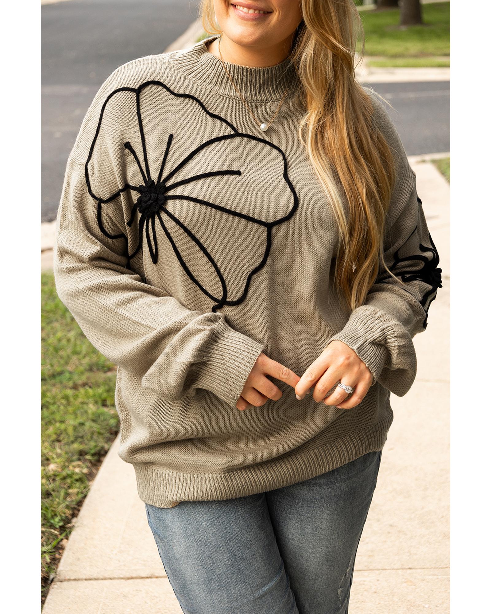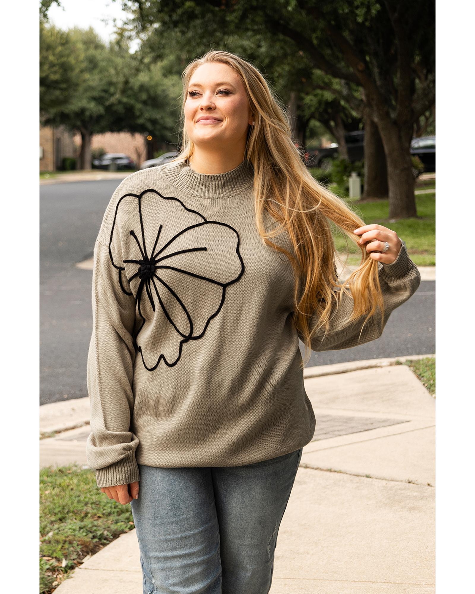 Dark Khaki Plus Size Big Flower Pattern High Neck Drop Shoulder Sweater – 4X