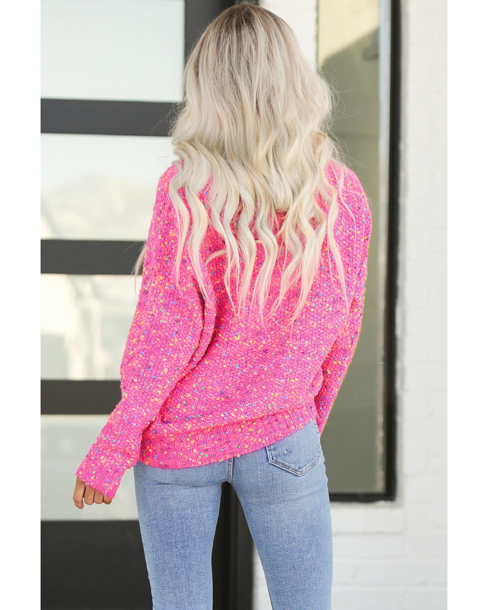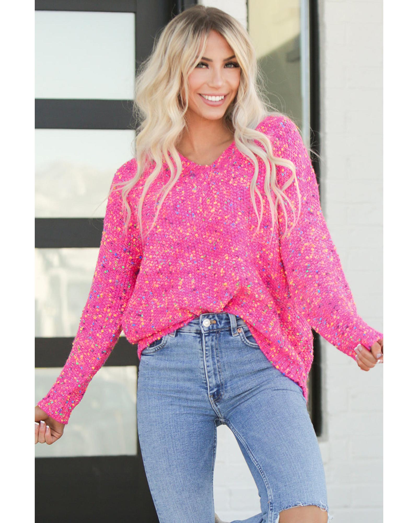 Dark Pink Colorful Spots Knitted V Neck Casual Sweater – M