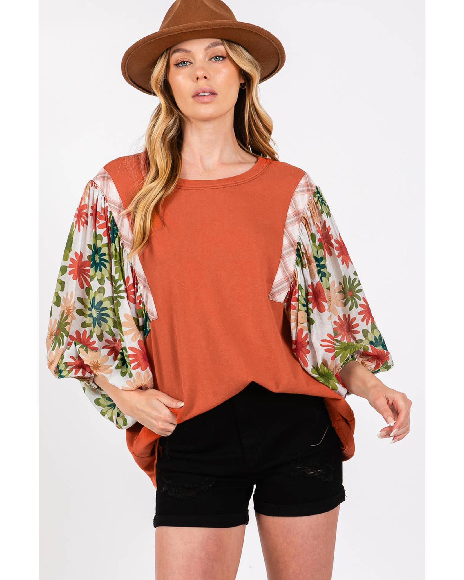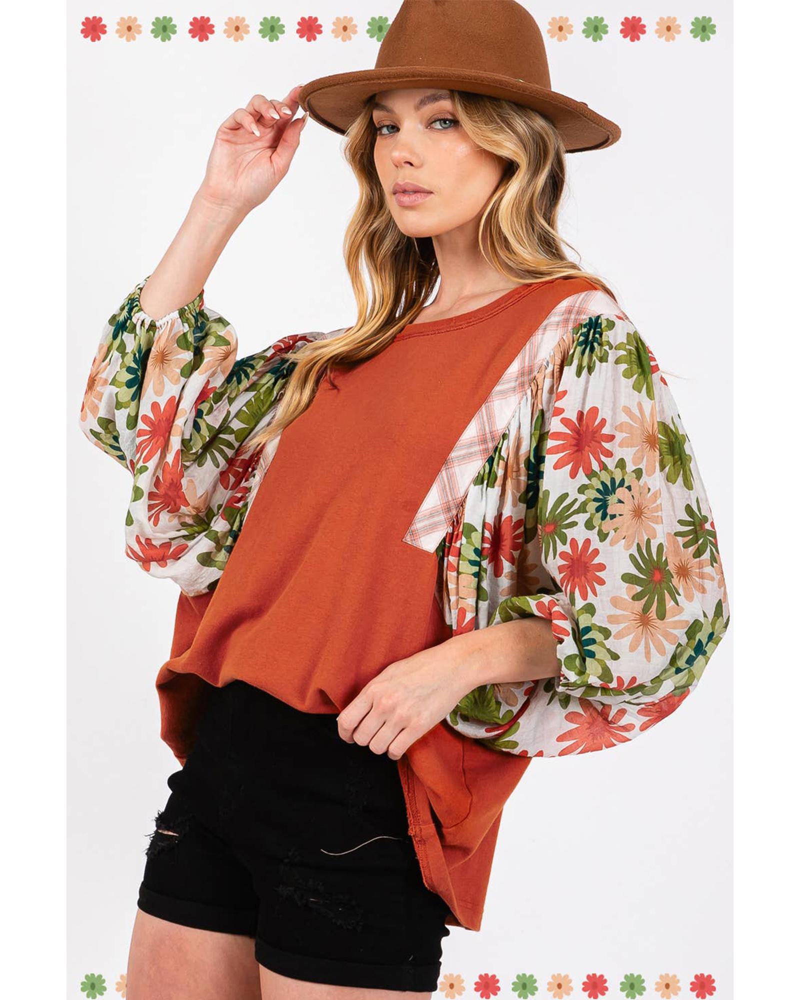 Desert Gold Floral Puff Sleeve Patchwork Round Neck Blouse – XL