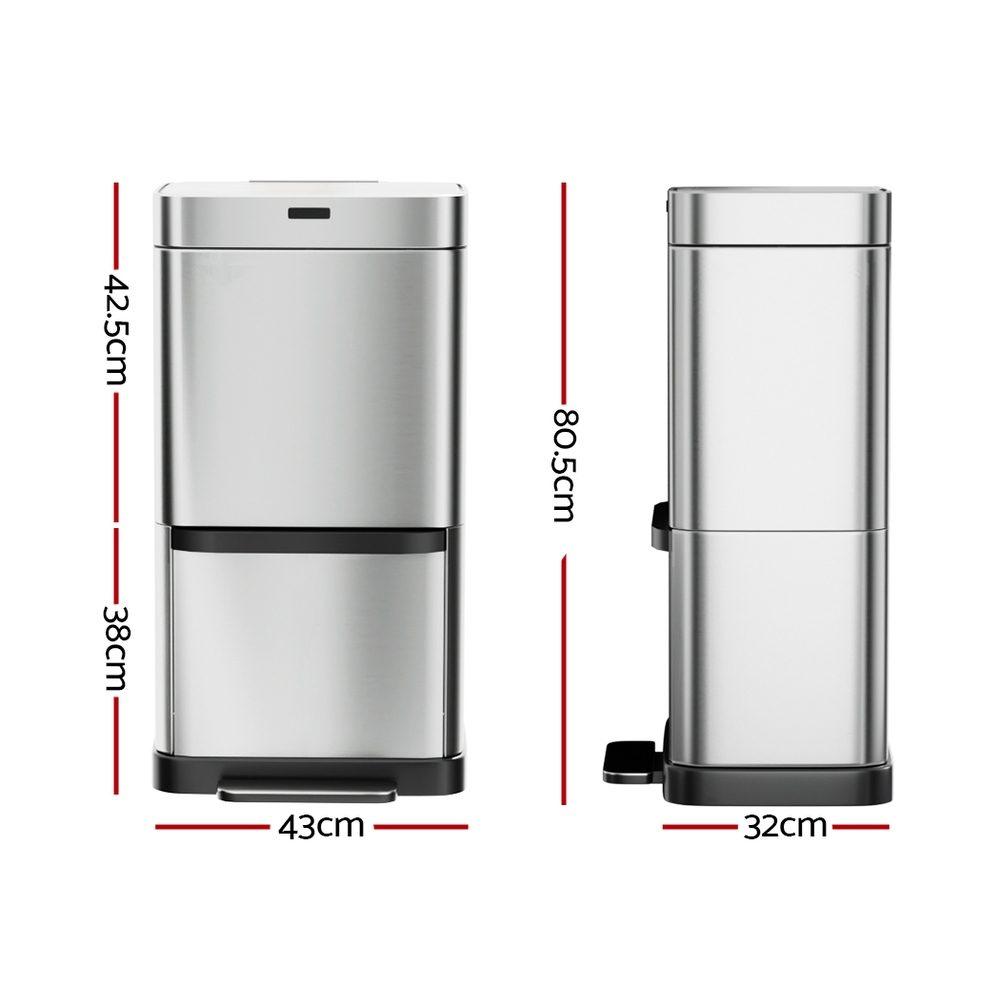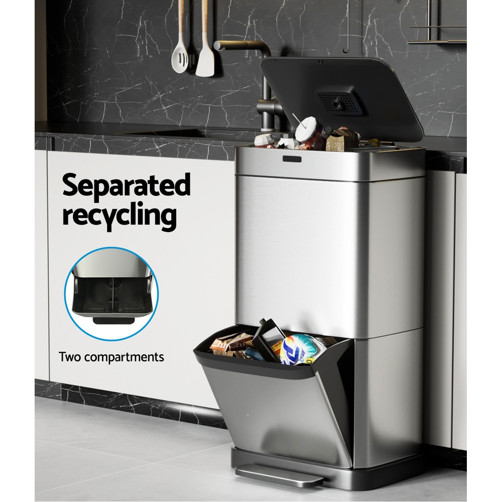 Keep your home clean, tidy and germ-free with a Devanti Recycling Motion Sensor Bin. Activated by just the wave of your hand (within a 20cm range) and a hands-free foot pedal, the motion sensor bin makes it easy to dispose of your trash cleanly and hygienically. With a large 70L capacity, you won’t need to clear your bin immediately to make room for more trash. The bin is divided into two compartments so you can dispose of your trash and recycling separately. A removable divider for the top compartment helps keep your different recycling needs separate. A fingerprint-resistant black surface keeps your kitchen looking shiny and bright. No more worrying about the bin liner moving out of position with the convenient liner holder. The soft opening and closing make the bin completely noise-free. Keep your home (and the planet) clean and clear with a Recycling Motion Sensor Bin from Devanti.