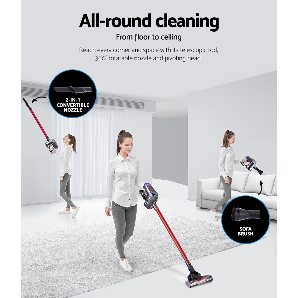 For the ultimate in easy vacuuming, our Devanti Handheld Vacuum Cleaner always makes for efficient cleaning. Its 160 pivoting head tilts and swivels, while the long-reach neck can get to those hard-to-reach spaces. It features a soft roller brush that is easy on floors, and hard on dirt. Fit with the included brush or crevice nozzles for every time of surface, nook or cranny. Run continuously for 20-35 minutes at a powerful 150W with 10,000pa suction power and 2 cleaning speeds. The one-handed design is lightweight and bagless, making it perfect for cleaning shelves, curtains, cars or other awkward niches. All collected dirt and debris pass through a washable and reusable HEPA filter that eliminates up to 99.97% of dust and allergens. Your purchase includes wall mounting accessories so you can store it easily and out of the way, and three filter replacements. Other features include an LED headlight to accurately spot dust, a one-click design to empty the dust container, and a quick charging 2000mAh Li-ion battery. Join the cleaning revolution and enjoy hassle-free vacuuming with a Devanti Handheld Vacuum Cleaner.