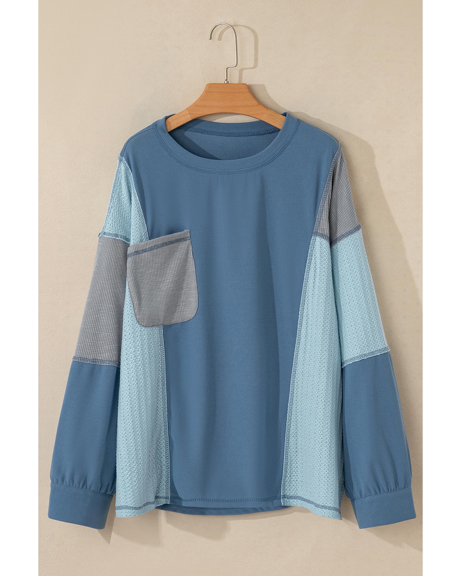 Dusk Blue Colorblock Stitching Patchwork Buttoned Long Sleeve Top – S