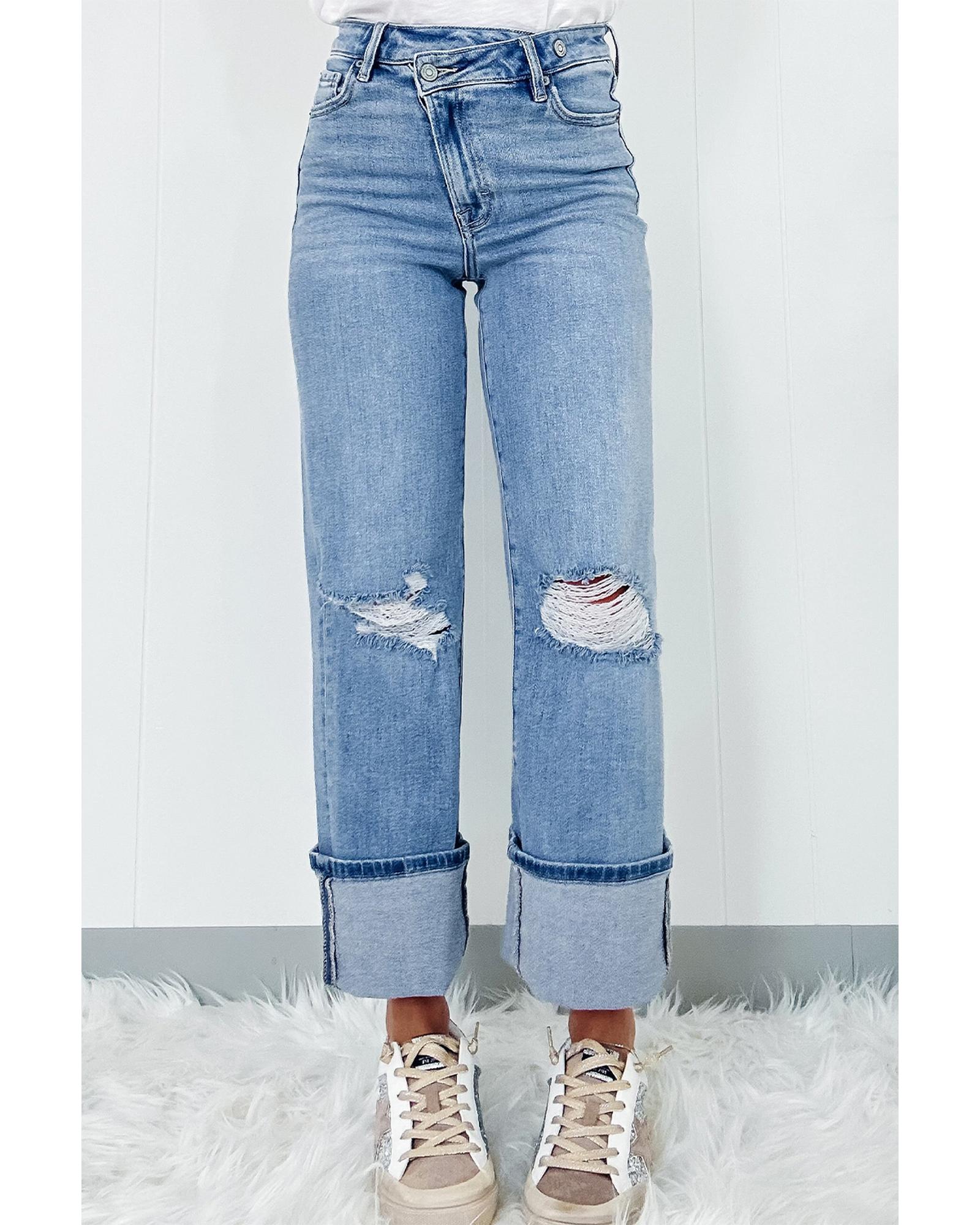 Dusk Blue High Rise Asymmetric Button Zip Fly Ripped Jeans – 16 US