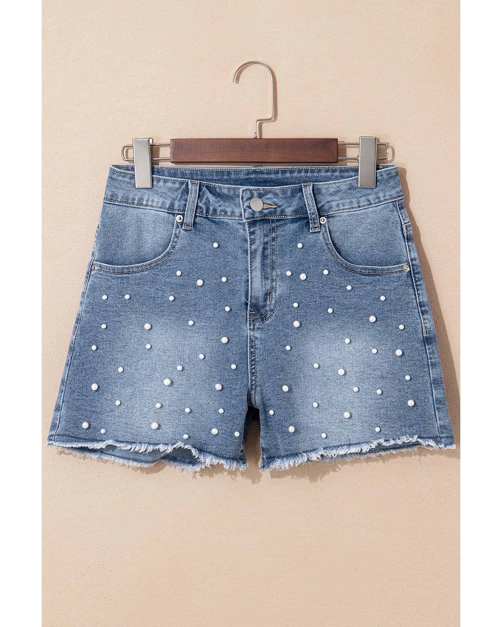 - Dusk Blue Pearl Beaded Raw Hem Medium Wash Denim Shorts