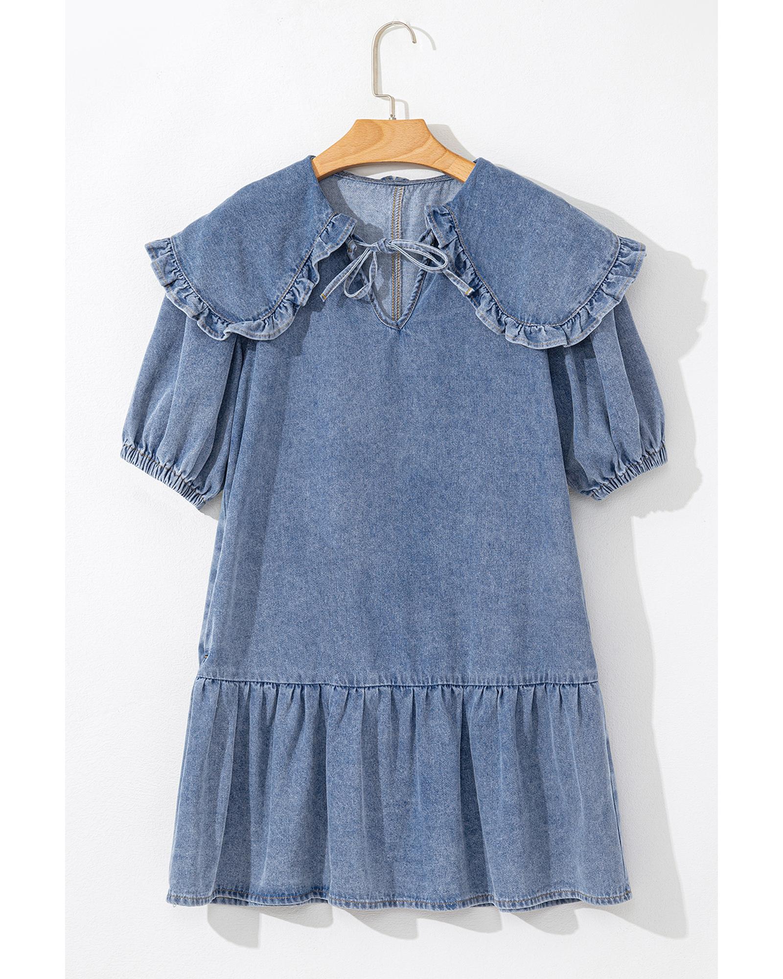 Dusk Blue Ruffled Collared Side Pockets Puff Sleeve Denim Mini Dress – L