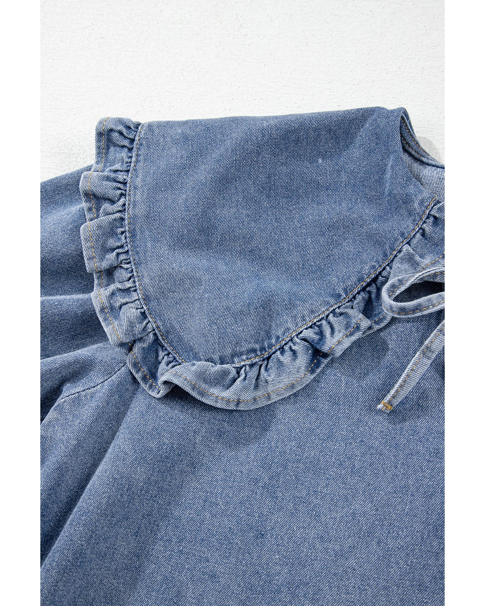 Dusk Blue Ruffled Collared Side Pockets Puff Sleeve Denim Mini Dress - M