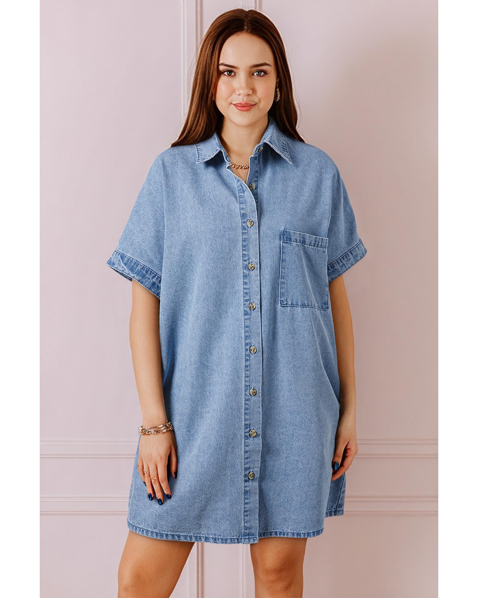 Dusk Blue Short Sleeve Pocketed Button up Denim Tunic Dress – M