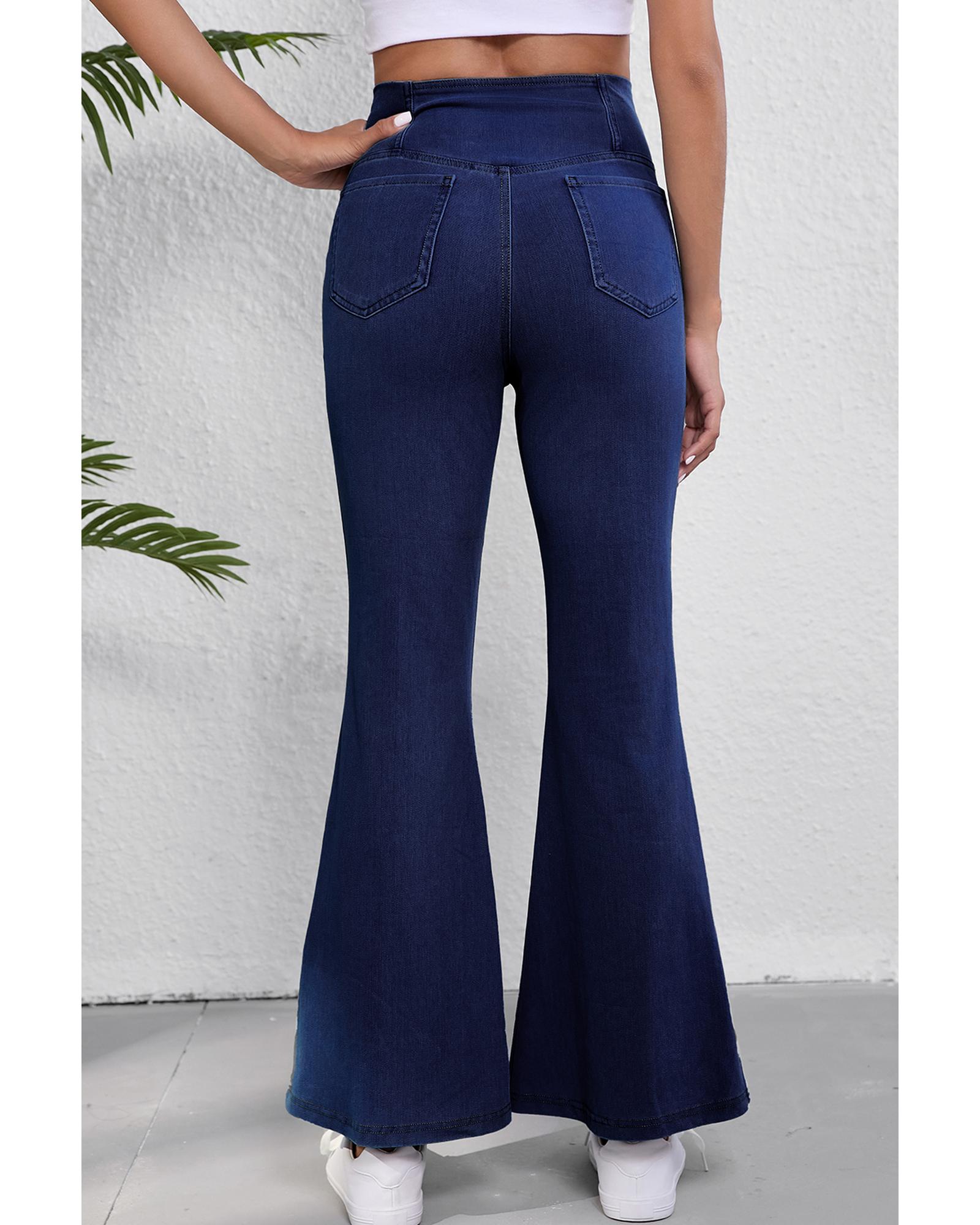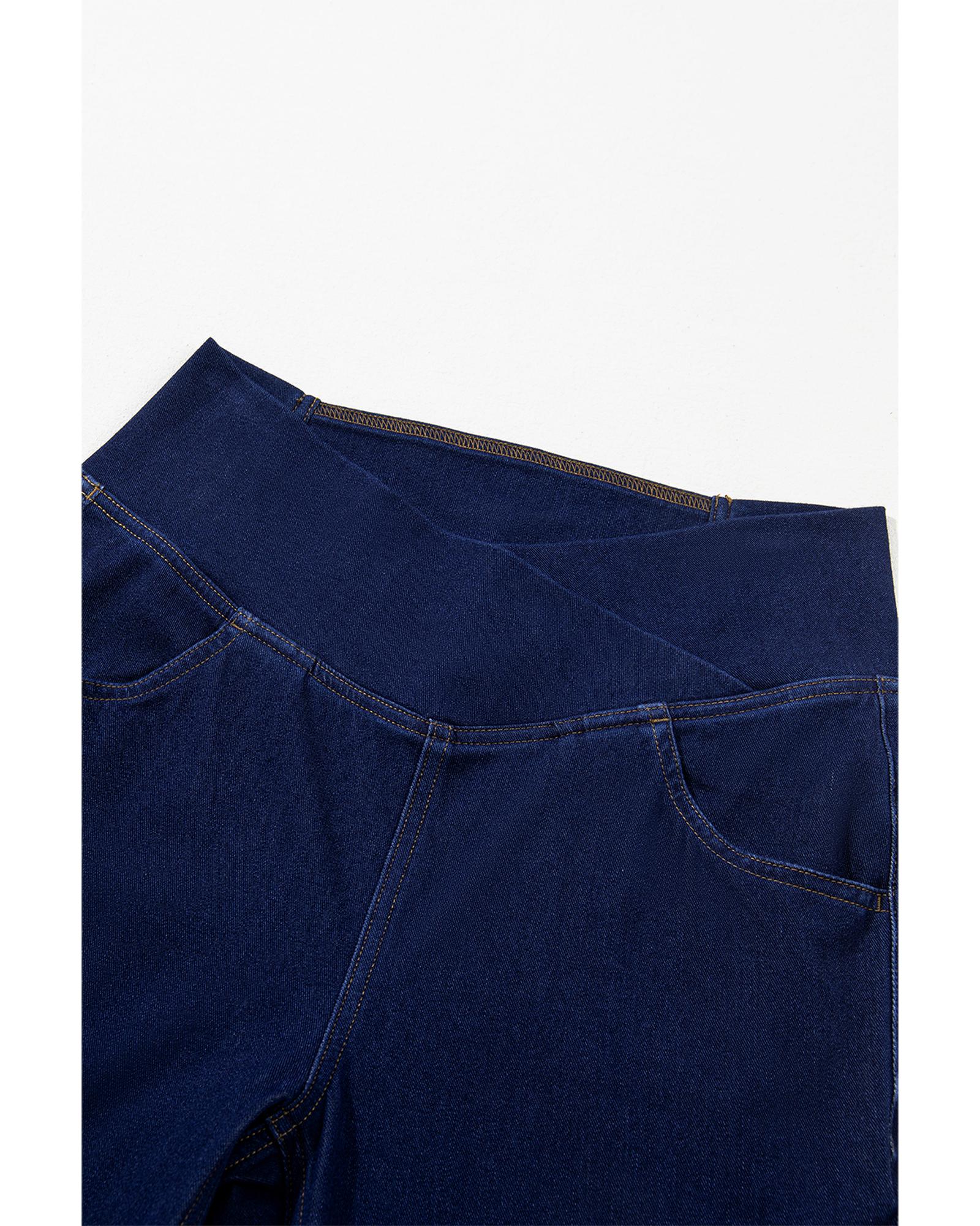 Dusk Blue Solid Crossed Waist High Elastic Fit Flare Knit Jeans – S