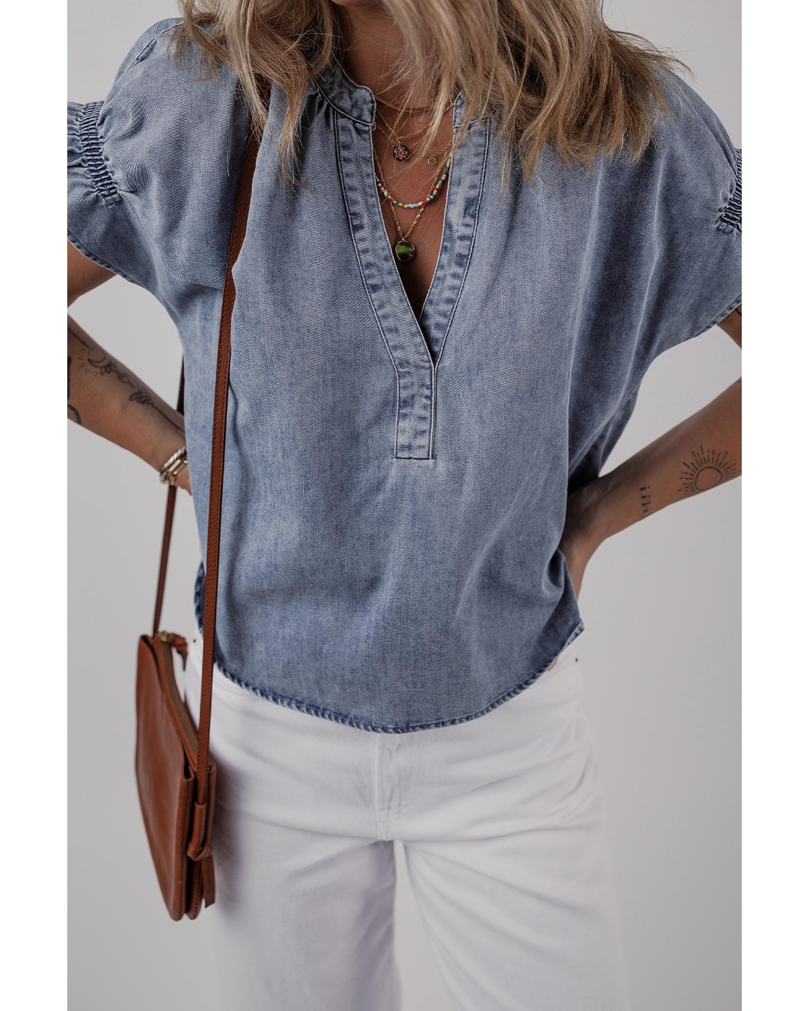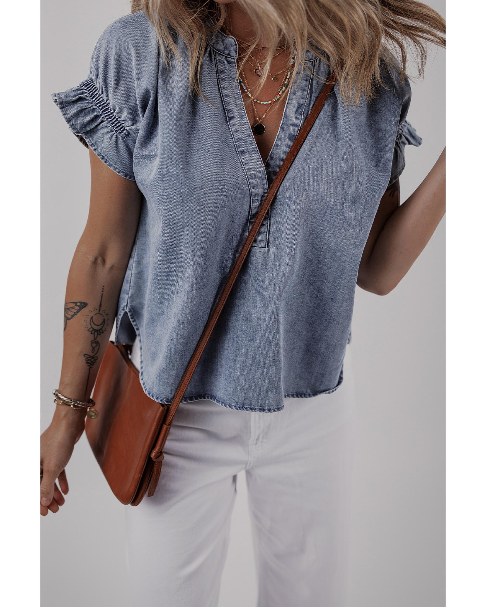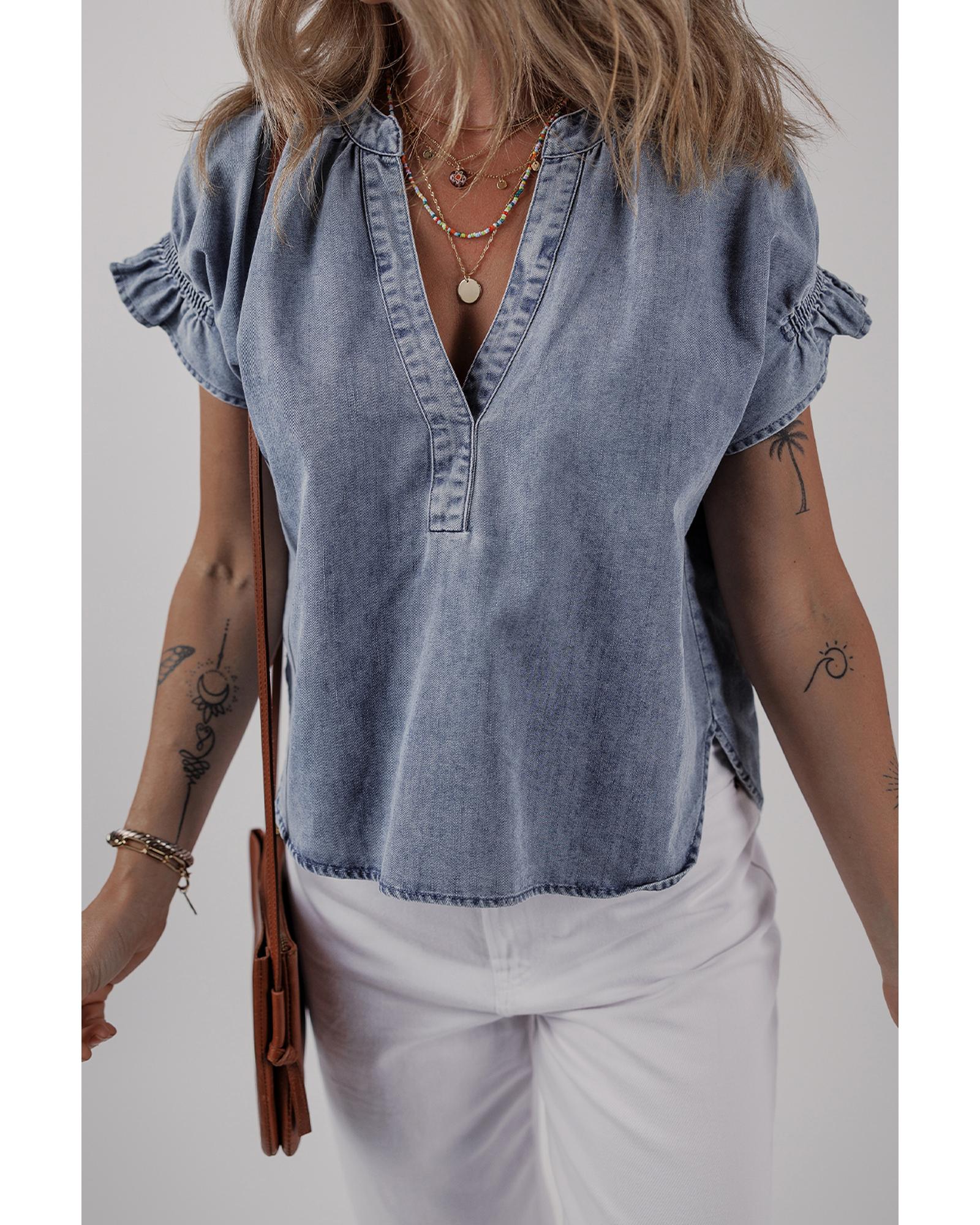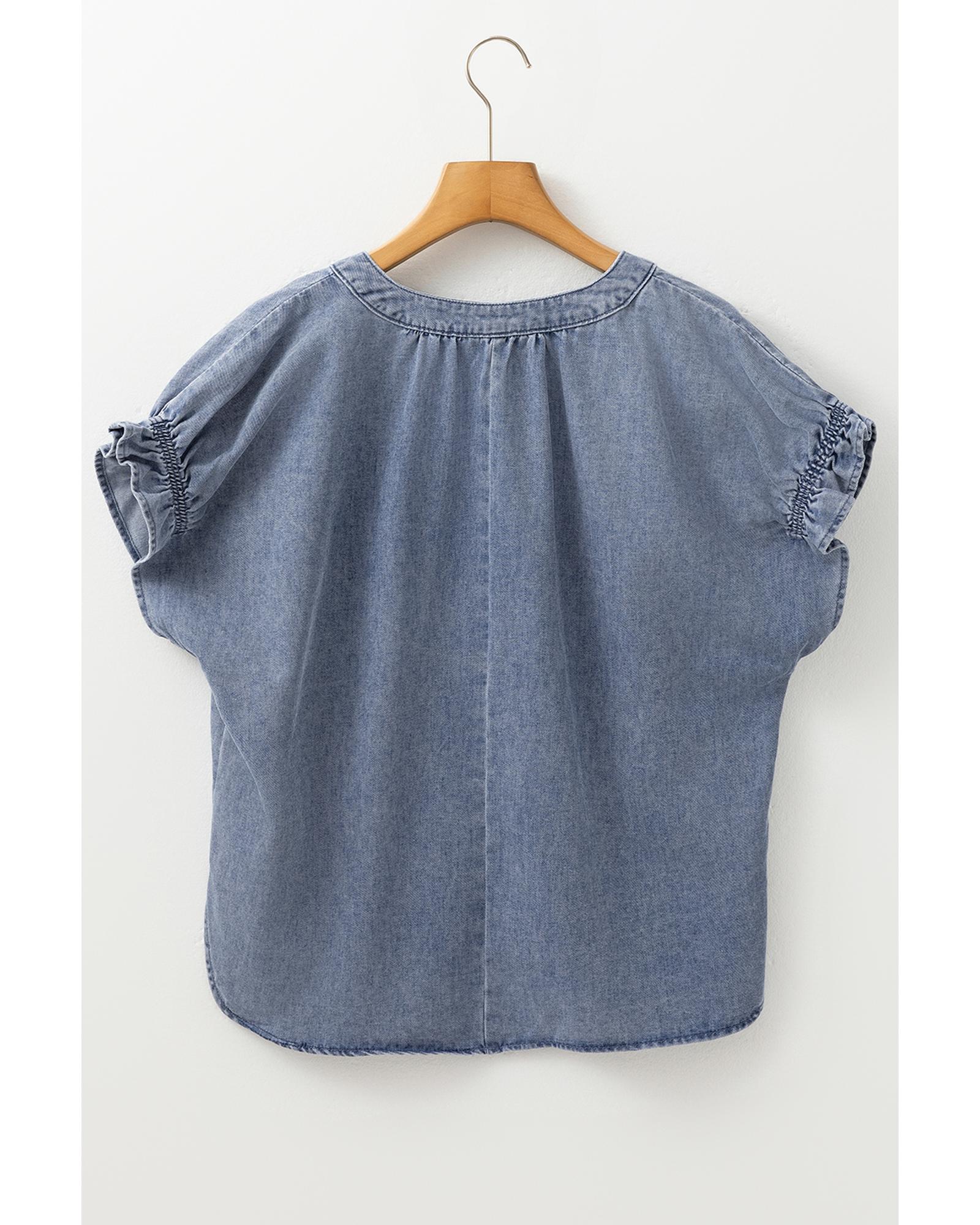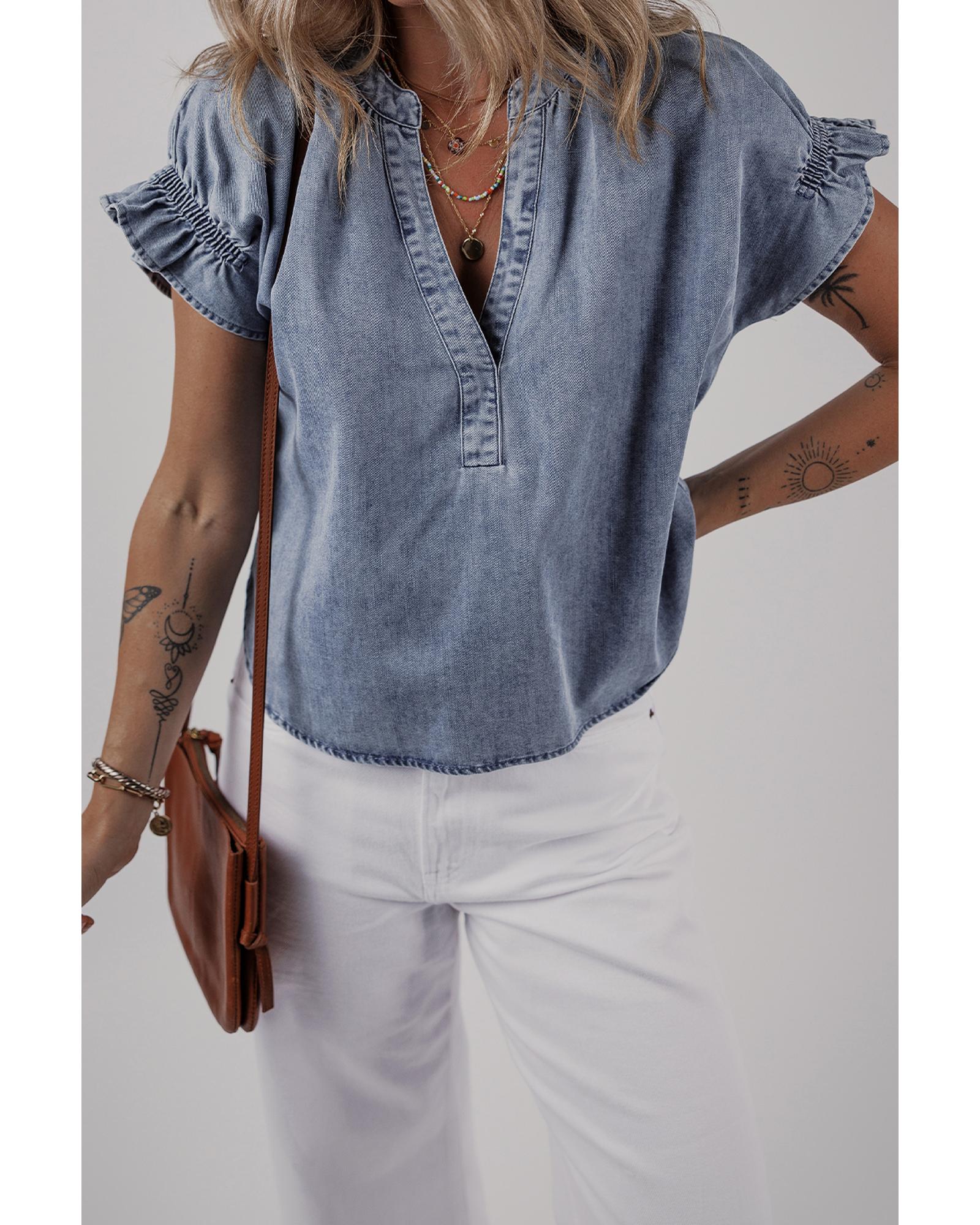 Dusk Blue V Neck Ruffled Short Puff Sleeve Denim Top – XL