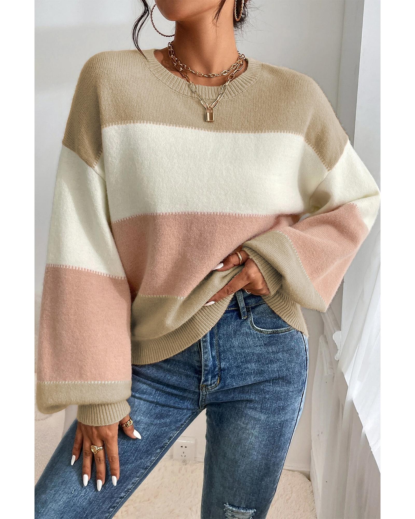 Dusty Pink Color Block Lantern Sleeve Drop Shoulder Sweater – L