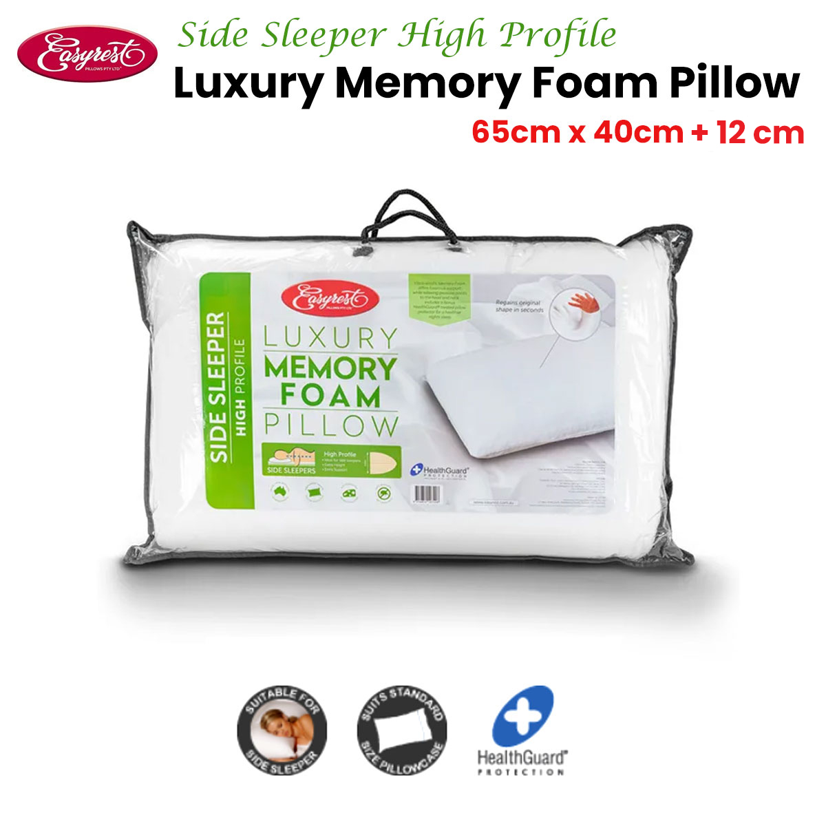 Luxury Memory Foam High Profile pillow offers support ideal for side sleepers. The visco-elastic Memory Foam offers luxurious approx 12cm height support whilst also relieving pressure points on the head and neck. The memory foam regains its shape in seconds and moulds to your individual shape of the head and neck. Includes a bonus HealthGuard treated cotton/poly pillow protector for a healthier night’s sleep.