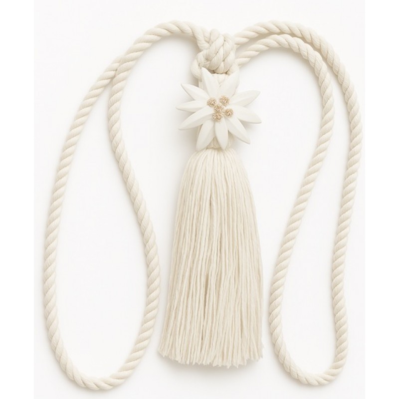 This tieback is a beautifully crafted piece that blends softness with sculptural elegance. Featuring a twisted white rope and delicate strands of white thread that form a soft flowing tassel. At the heart of the tieback is an edelweiss deigned flower, made form a smooth ceramic. Its pointed petals radiate outward in a starburst-like formation, and the center is adorned with gold-toned finish.