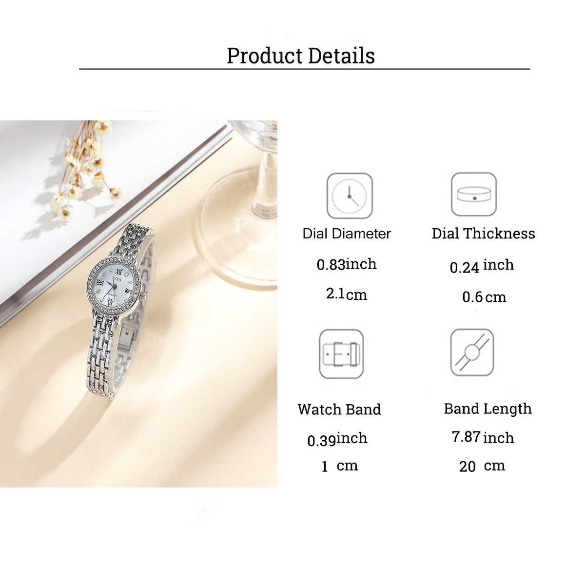 - Stylish Quartz Watch: Crystal-accented bezel, classic dial with Roman numerals, and a polished metal link band. Dial Diameter: 2.1cm (0.83inch), Dial Thickness: 0.6cm (0.24inch), Band Width: 1cm (0.39inch), Band Length: 20cm (7.87inch).