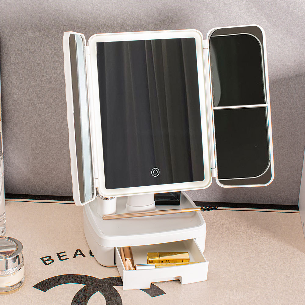 Transform your beauty routine with the Elegant Tri-Fold Shell LED Vanity Mirror, a stylish and multifunctional makeup companion. This smart mirror features a unique shell-inspired tri-fold design with built-in LED lights for perfect illumination, a convenient storage drawer, and a sleek white finish. Ideal as a thoughtful gift, it combines practicality with elegance for daily use or travel.