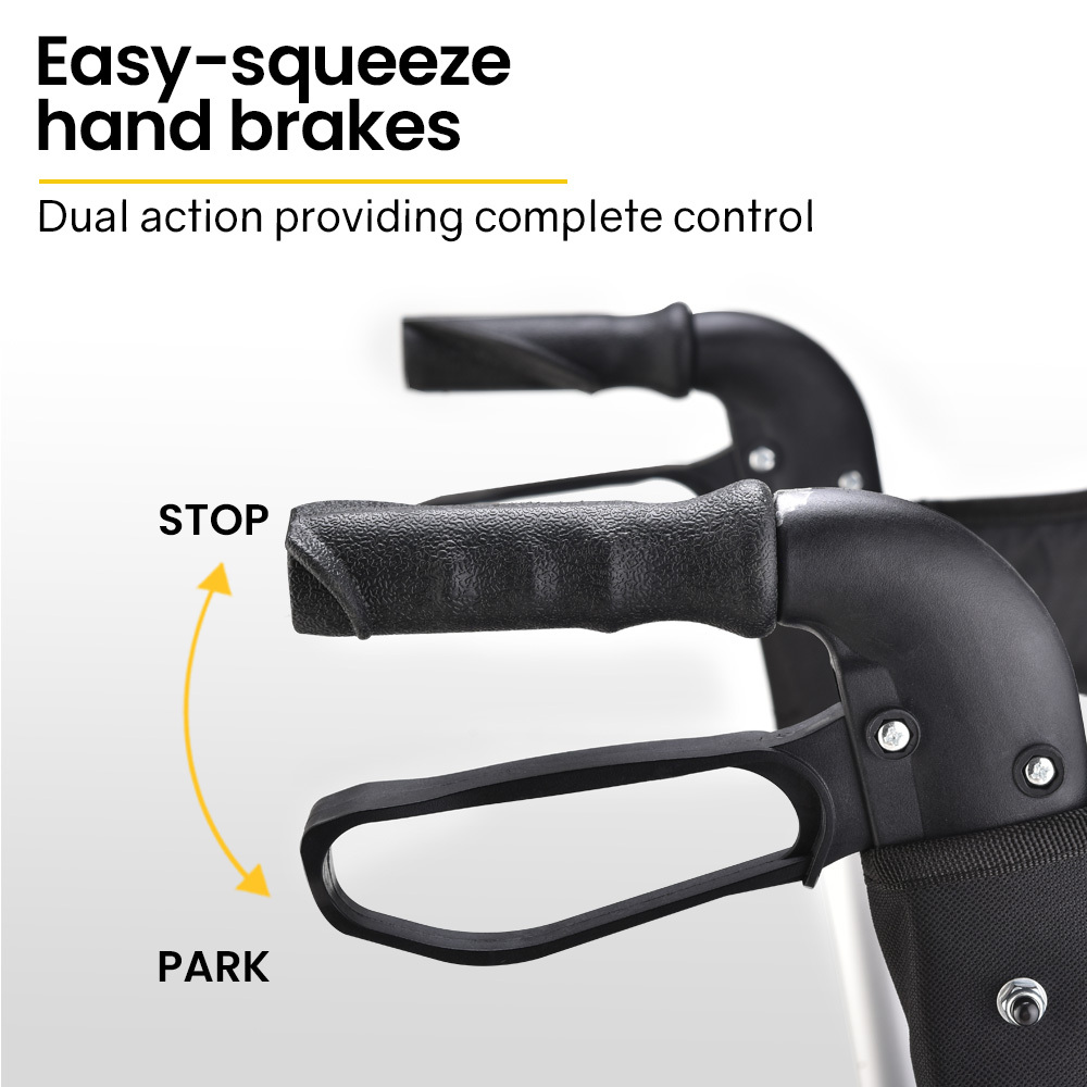 Large 8″ PVC wheels allow the walking frame to roll smoothly over the bumps on a range of surfaces, and the soft rubber tread provides grip both inside and outside. The height adjustable handles offer a highly ergonomic design and feature easy-squeeze dual action brakes. Pushing down on the brake levers activates the park brakes, enabling you to take advantage of the stable seat to rest and watch the world go by.