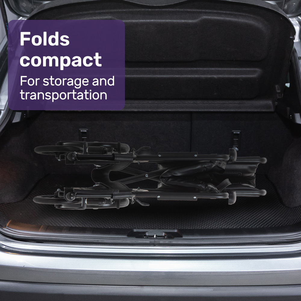 Thick 12-inch rear wheels ensure a smooth ride over bumps on a range of surfaces. Not only that, they also offer the practicality of not requiring to be refilled with air and will never experience a puncture! With a swift 2-second folding action, caregivers can easily transport this wheelchair wherever it’s needed.