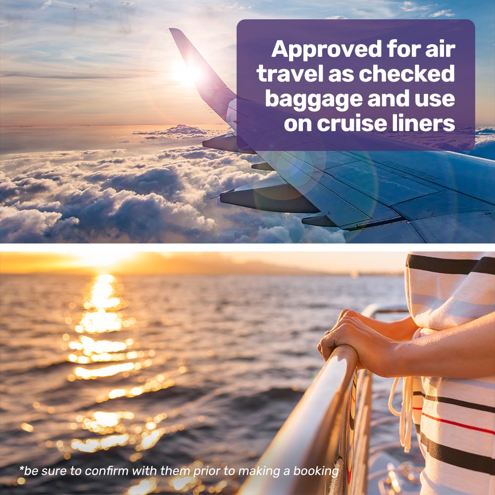 - 288Wh battery capacity is permitted on most Airlines and Cruise Liners (check with them prior to making a booking)