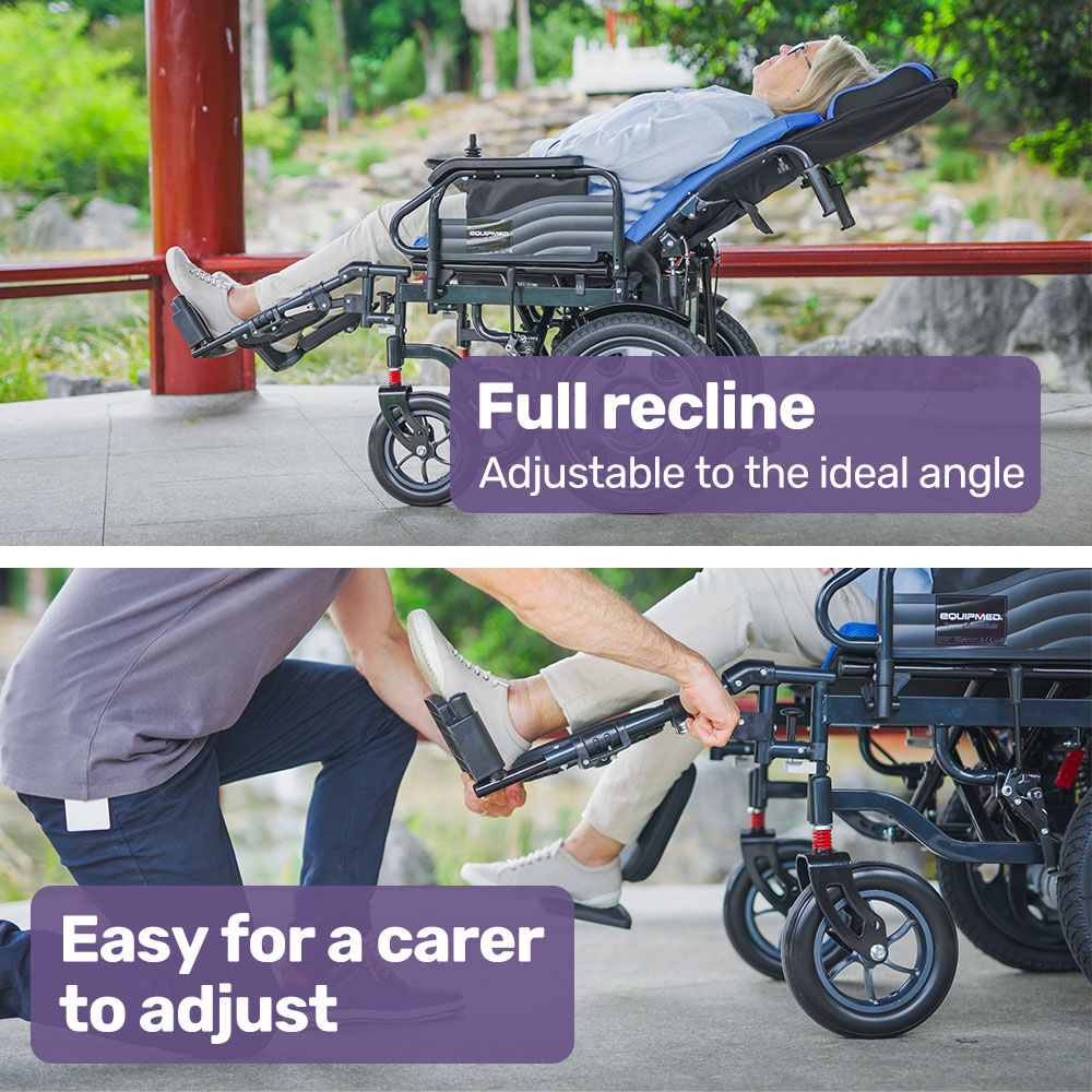 The Equipmed motorised power wheel chair is quick to fold. Plus, a sturdy steel frame and easy-to-remove lithium battery mean that it is as light as possible for loading into a car boot or moving into a space-saving storage position.