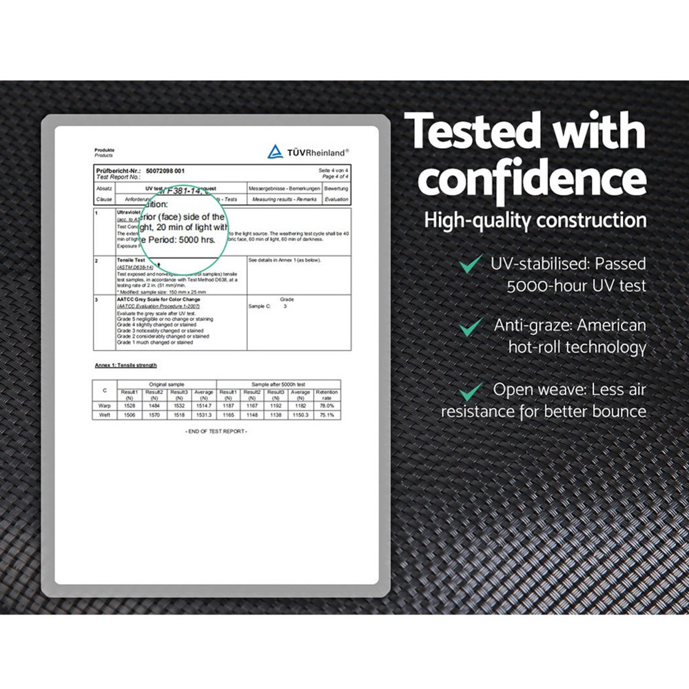 Bounce to your heart’s content with our Trampoline. With its superior bounce characteristics featuring 72-piece triple rate springs, the 12-foot trampoline enables safe and durable bouncing with no worries. The heavy-gauge steel framework is designed to handle all robust play and is UV-tested for quality and reliability. Other great features include 8 posts for strong support, 20mm thick padding, anti-graze mat, safety netting and a double-lock zip-and-clip entry. So jump to it and order our trampoline today.