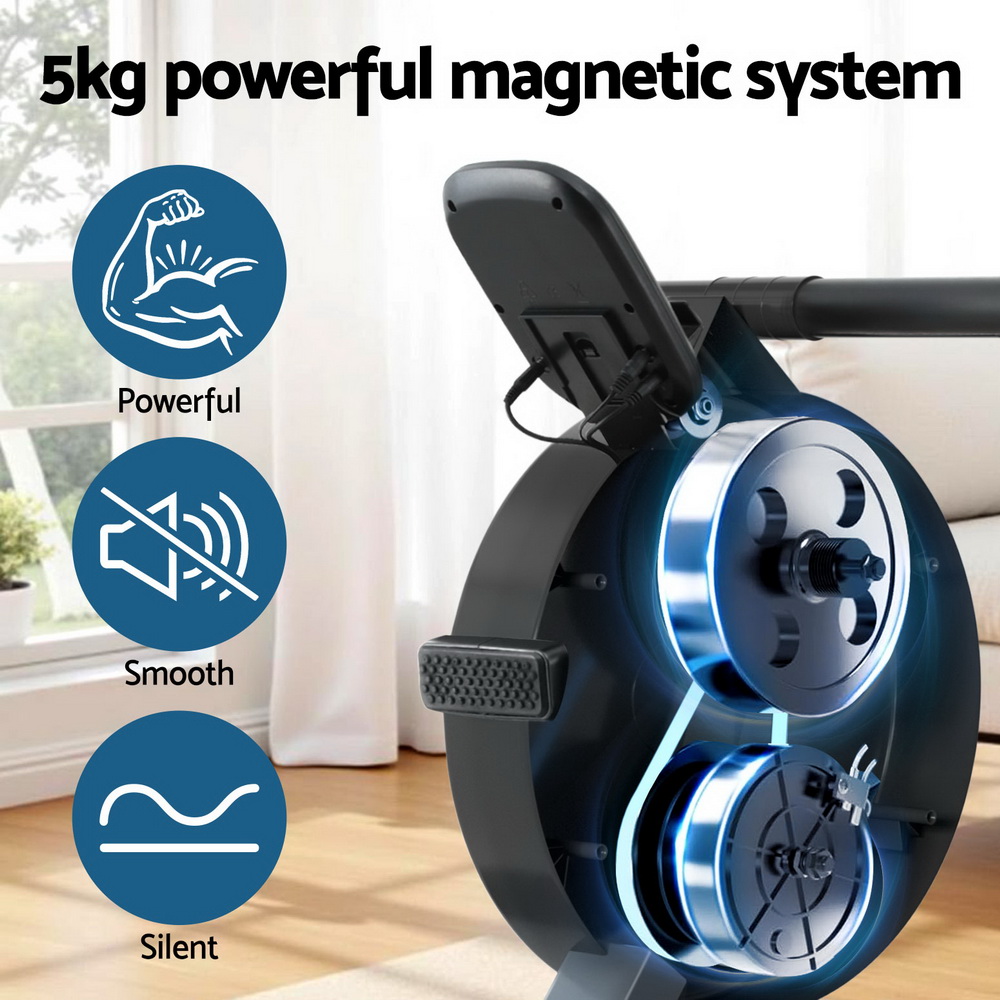 The Everfit 16 Level Magnetic Rowing Machine delivers a premium home workout experience. Featuring smooth magnetic resistance, app-compatible tracking, and a 5kg flywheel, this rower machine supports users up to 120kg. Perfect for cardio strength training, its foldable design saves space. Enjoy quiet, efficient workouts anytime!