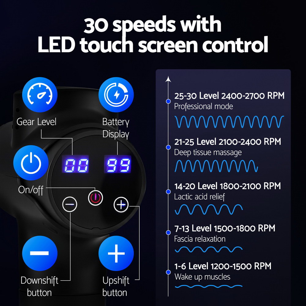 Whether you’re a hard-core gym junkie, a dedicated office worker or recovering from an injury, you’ll find relief with an Everfit Massage Gun. With a powerful high-torque brushless motor, the massage gun allows for high-frequency vibration at 1200-2700 strokes per minute and penetrates deeply for muscle relaxation from the comfort of home. The massage gun uses long-lasting and efficient rechargeable lithium batteries that allow the gun to run for up to 3 hours. There are 30 speed levels to suit various purposes; from simply waking up your muscles to relieving lactic acid and assisting muscle recovery after exercising, or even intense professional-level massages. The non-slip rubber handle provides a comfortable grip to reduce hand fatigue, and the device operates quietly for a comfortable massage experience. The smart touch LED display makes it easy to customize your massage experience. With 8 unique head attachments, the Everfit Massage Gun can help you dissipate fatigue, relax your muscles and relieve neck and back pain. Gets yours today and continue your fitness journey in comfort.