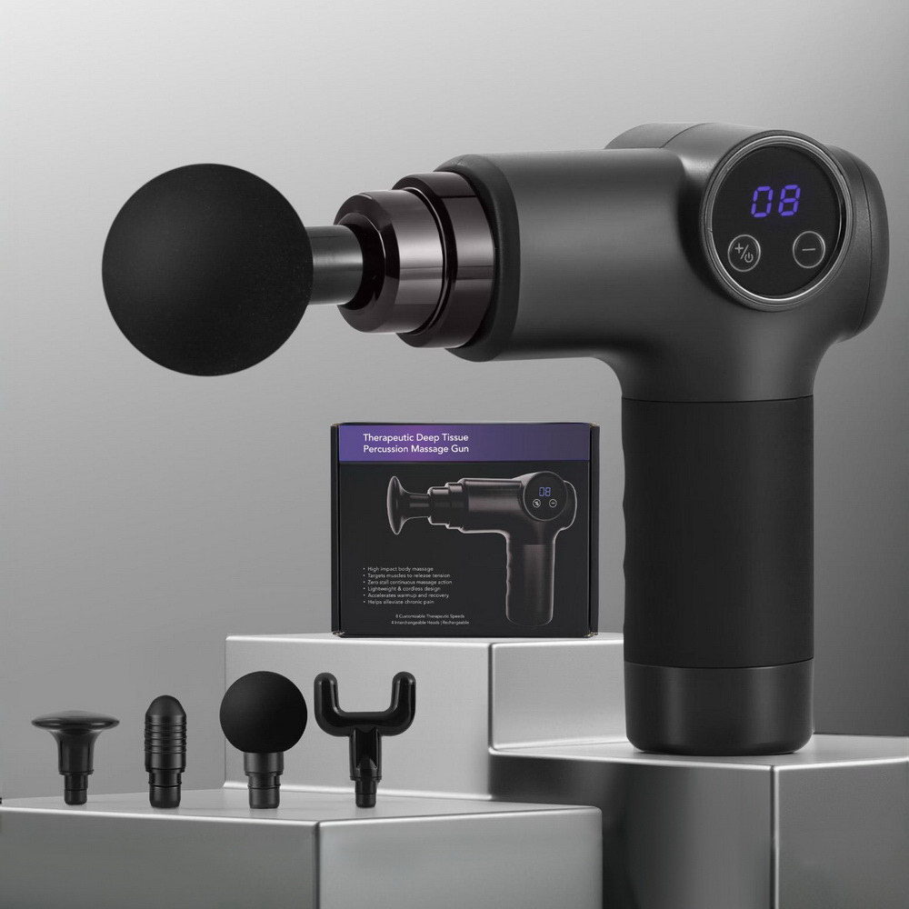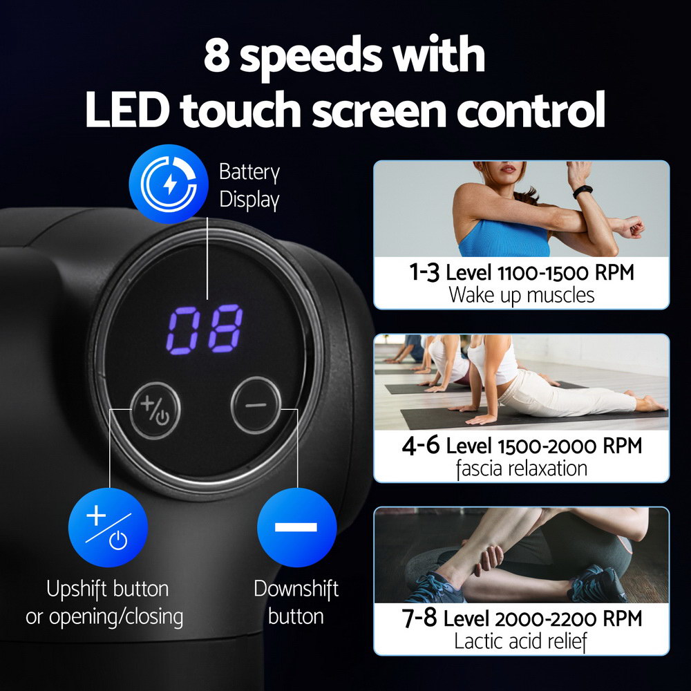 Whether you’re a hard-core gym junkie, a dedicated office worker or recovering from an injury, you’ll find relief with an Everfit Massage Gun. With a powerful high-torque motor, the massage gun allows for high-frequency vibration at 1100-2200 strokes per minute and penetrates deeply for muscle relaxation from the comfort of home. The massage gun uses long-lasting and efficient rechargeable lithium batteries that allow the gun to run for up to 2 hours. There are 8 speed levels to suit various purposes; from simply waking up your muscles to relieving lactic acid and assisting muscle recovery after exercising, or even intense professional-level massages. The non-slip rubber handle provides a comfortable grip to reduce hand fatigue, and the device operates quietly for a comfortable massage experience. The smart touch LED display makes it easy to customize your massage experience. With six unique head attachments, the Everfit Massage Gun can help you dissipate fatigue, relax your muscles and relieve neck and back pain. Gets yours today and continue your fitness journey in comfort.
