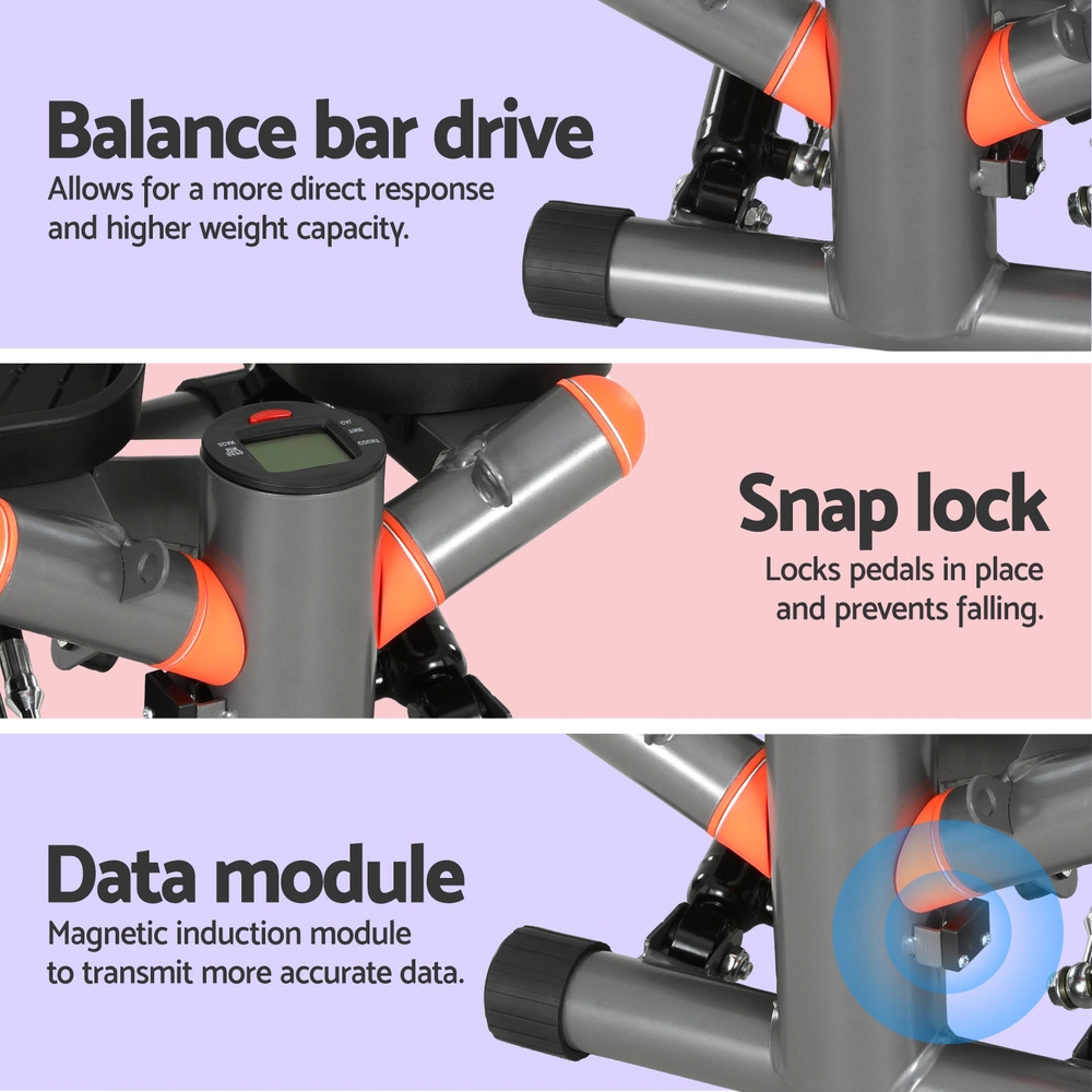 Step up your fitness game with a Mini Stepper from Everfit. Target your thighs, calves, waist and hips without leaving your home. The Mini Stepper is portable thanks to its miniature size, making it perfect for use under your desk, in the living room, or on the go. The stepper has an anti-slip pedal surface and edge for safety and stability, and your package includes a non-slip rubber mat to keep everything in its place. The stepper has a high weight capacity of 150kg and the upgraded mute ring design operates quietly for a pleasant exercise session that wont disturb your guests or family. The LCD screen will show you all your fitness data as you exercise, and the detachable soft pedal pad is easy on your feet and easy to maintain. It requires no assembly and folds neatly away when not in use. Best of all, the stepper comes with two bonus resistance ropes so you can perform a variety of exercises. Get fit today from the comfort of your home or office with the versatile Everfit Mini Stepper.