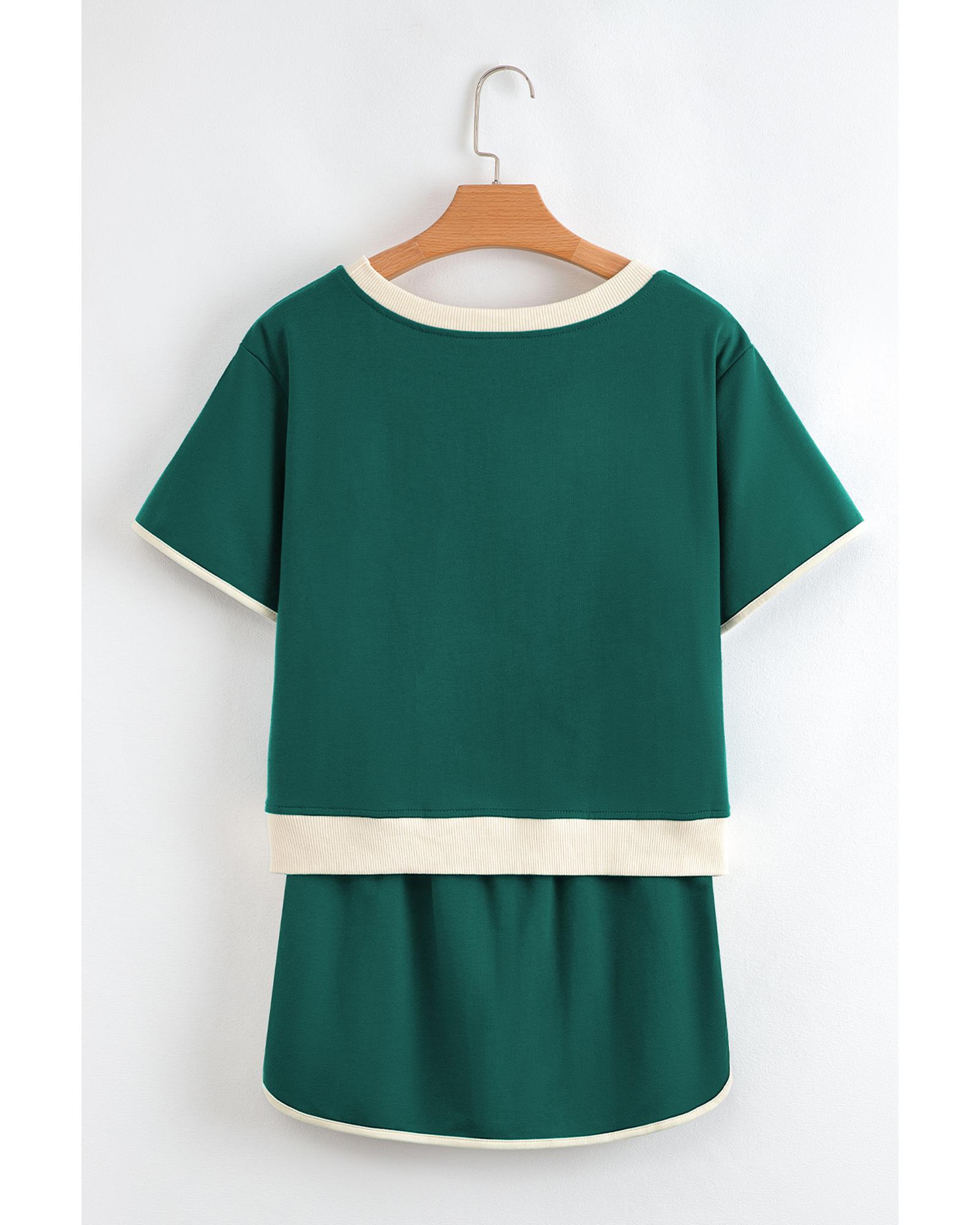 Evergreen Colorblock Edge Drop Shoulder T Shirt and Skirt 2Pcs Set – L