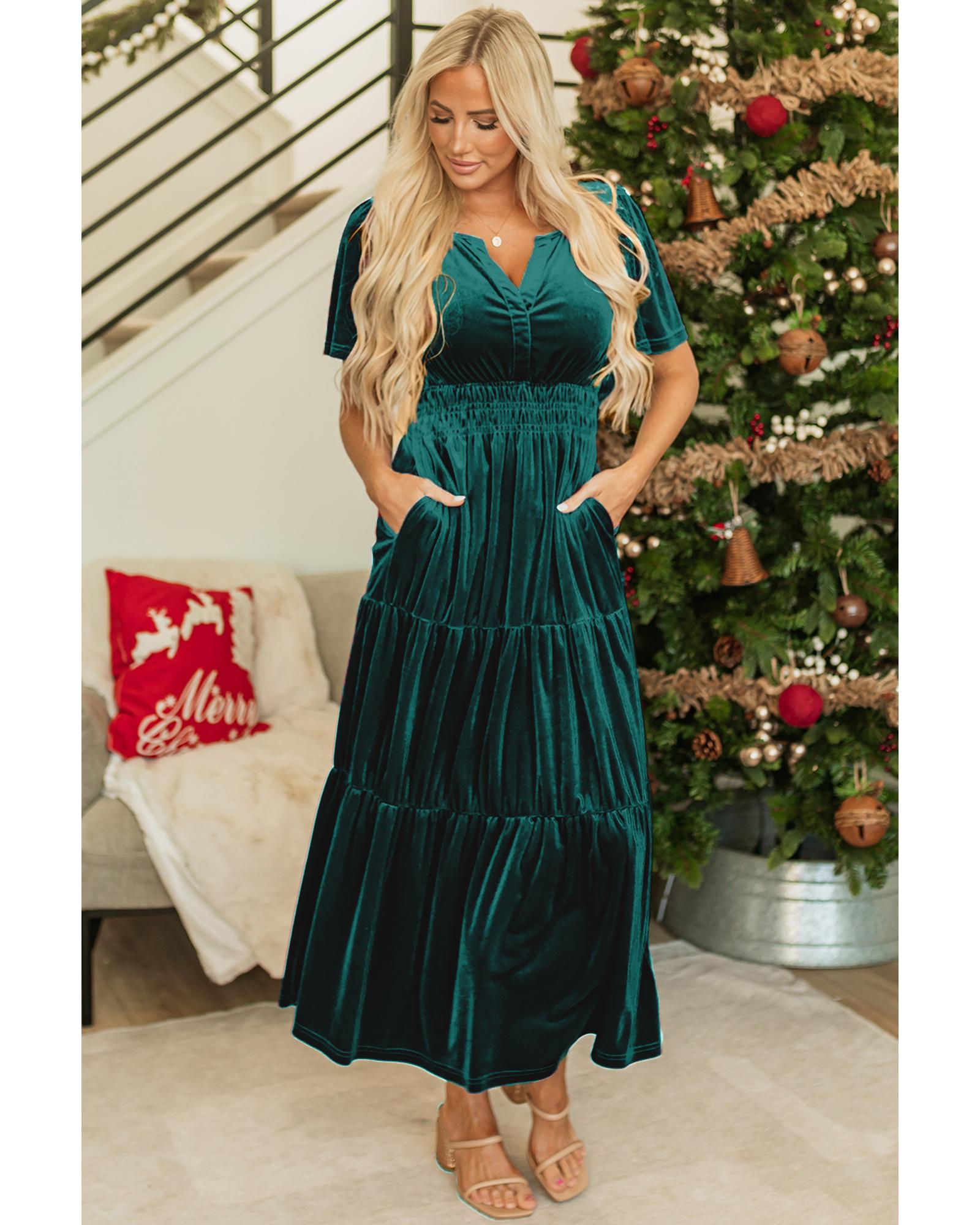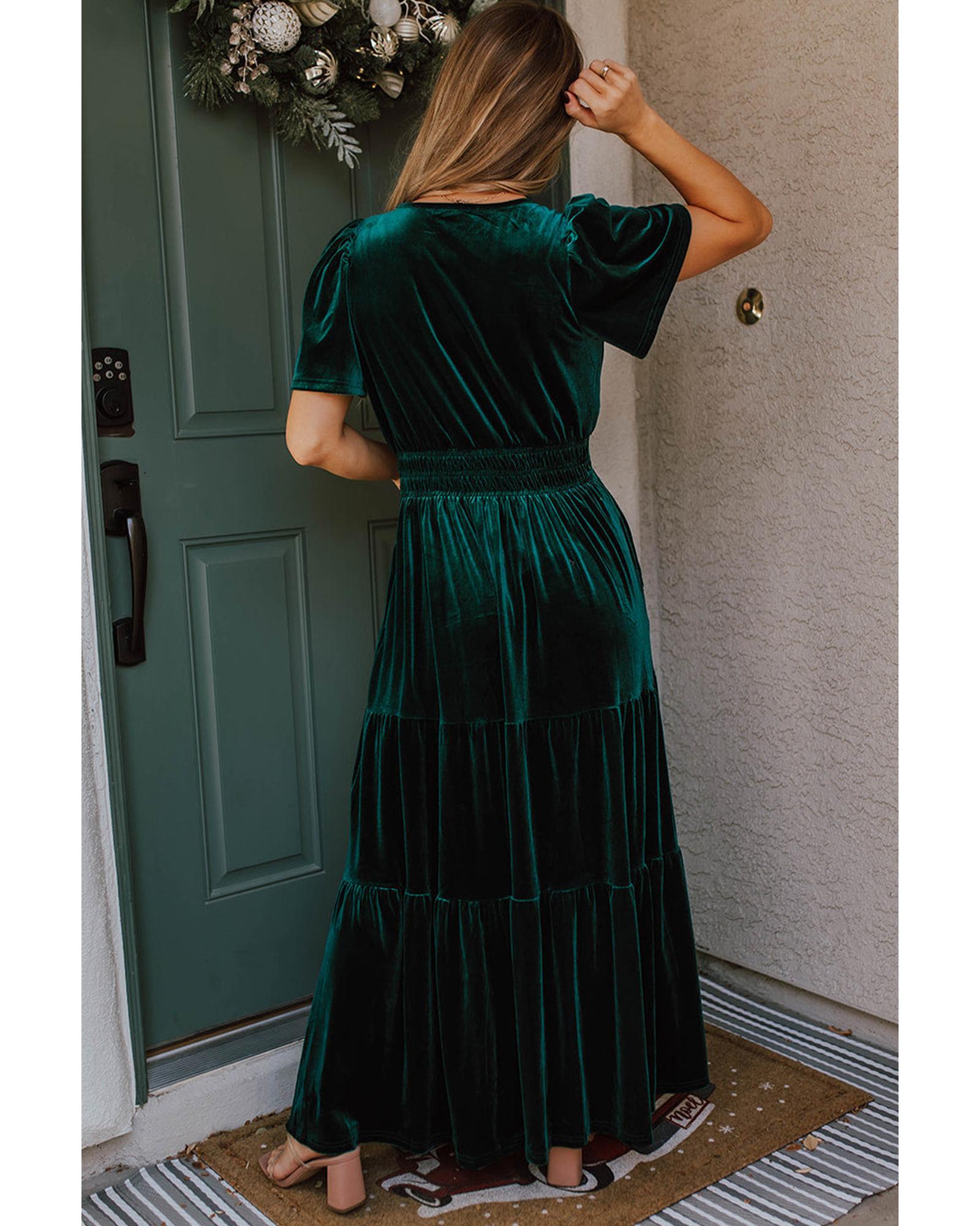 • Evergreen velvet short sleeve shirred waist tiered maxi dress