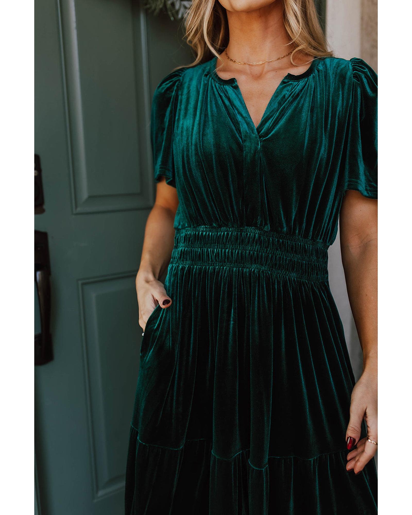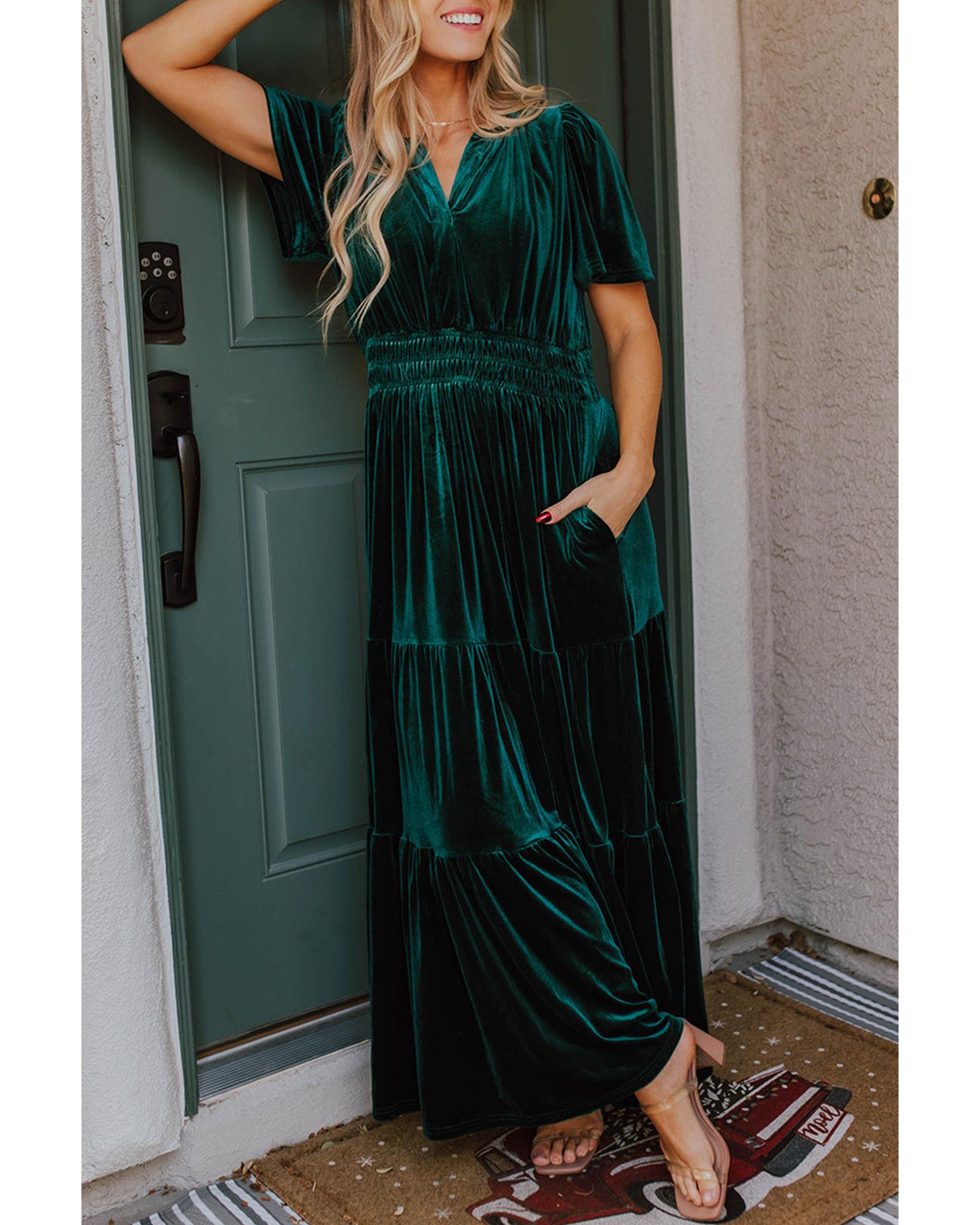 - Evergreen velvet short sleeve shirred waist tiered maxi dress