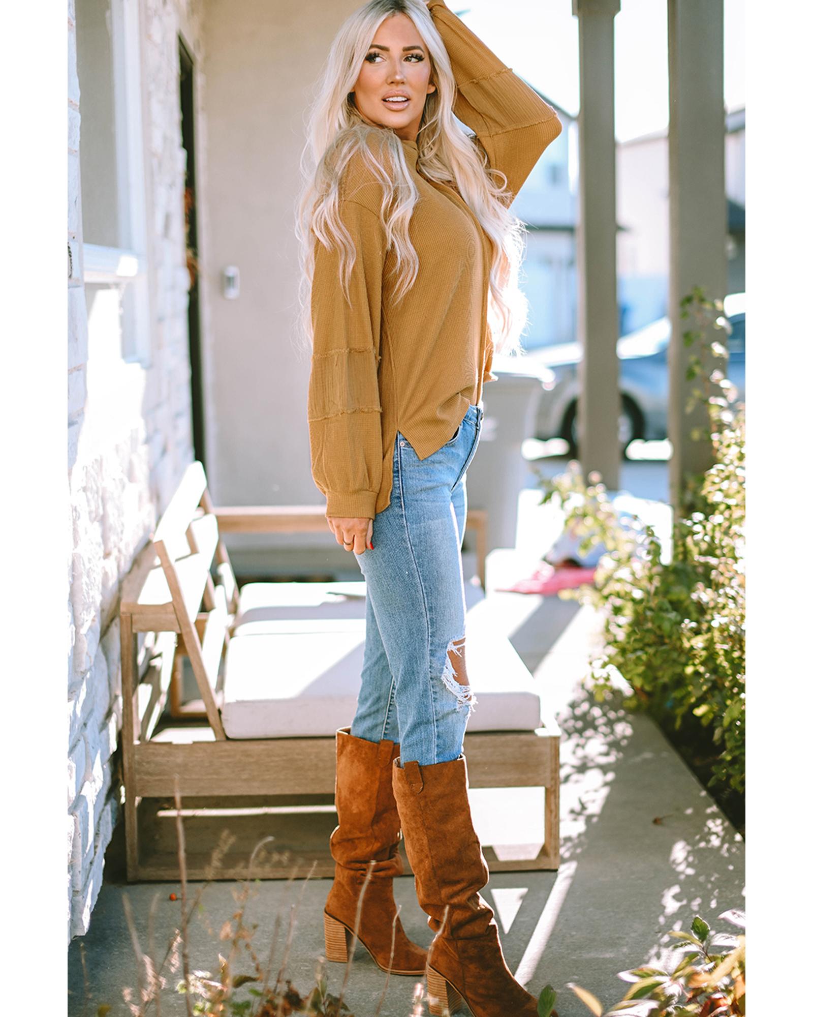 Exposed Seam Patchwork Bubble Sleeve Waffle Knit Top – L