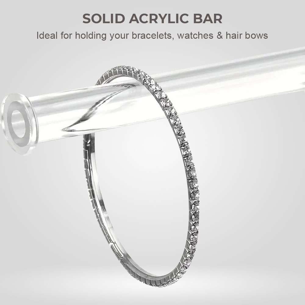 Elevate your jewelry organization with this clear acrylic jewelry stand featuring a simple design and sturdy structure. With 2 bars, it provides ample space to hang various jewelry, creating a sophisticated and elegant look anywhere in the room. The large-capacity jewelry tower ensures quick and easy access to your bracelets and necklaces in a clean and organized space. Easy to install with included tools and instructions, this bracelet holder is a perfect gift for special occasions.