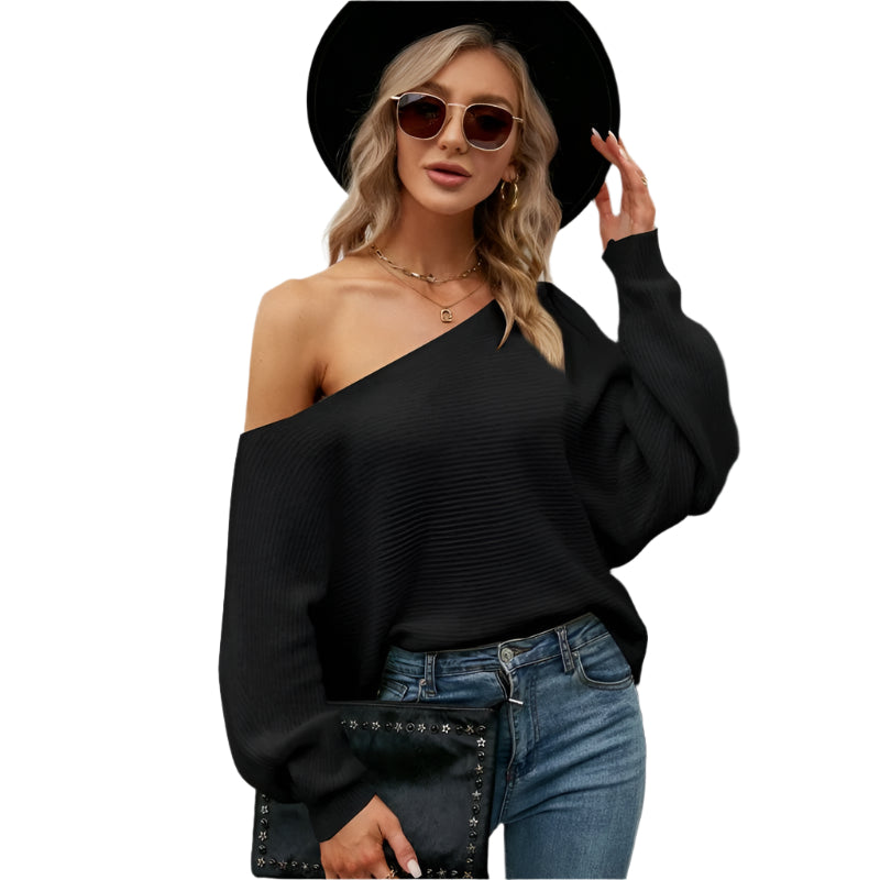 Female Sexy Strapless Knit Shirt Loose Bat Sleeve Knitted Tops – Black – M