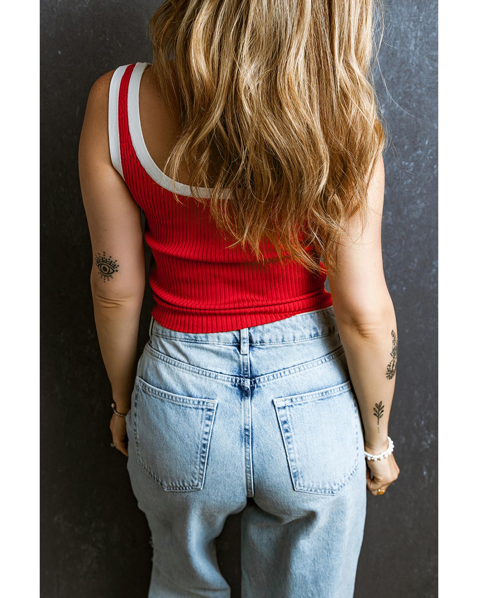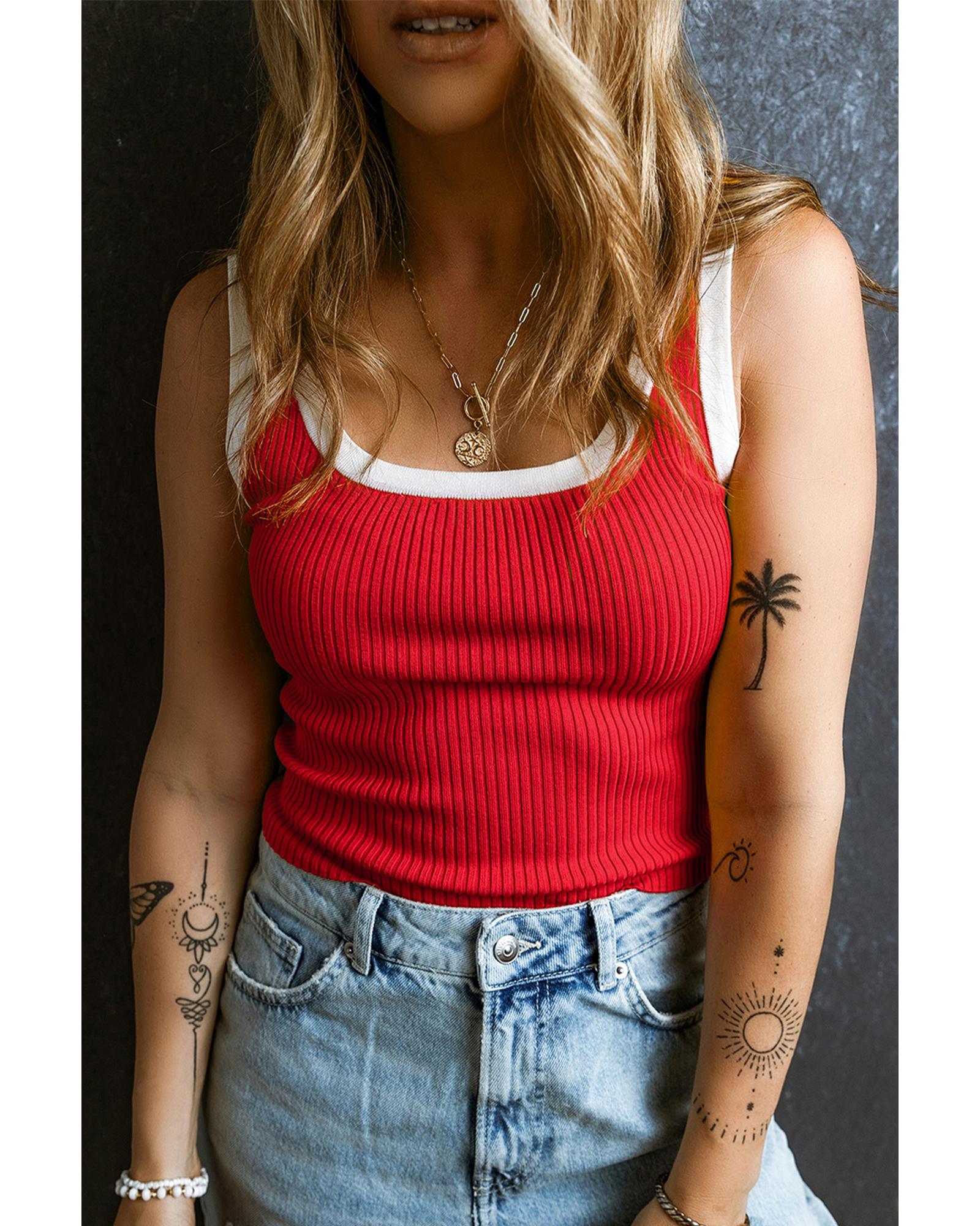 Fiery Red Colorblock Edge Ribbed Knit U Neck Tank Top – L