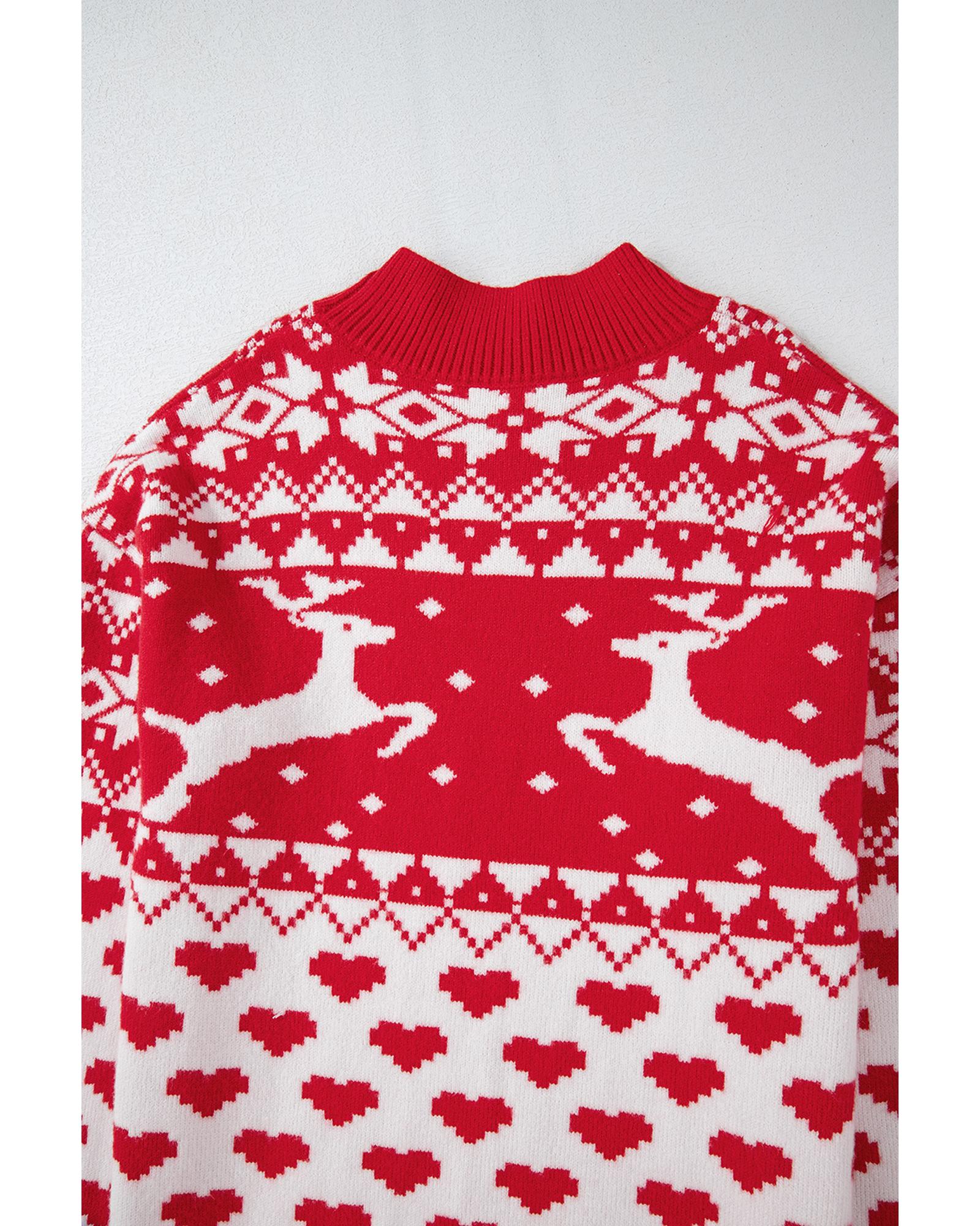 - Fiery Red Merry Christmas Reindeer Heart Pattern High Neck Sweater