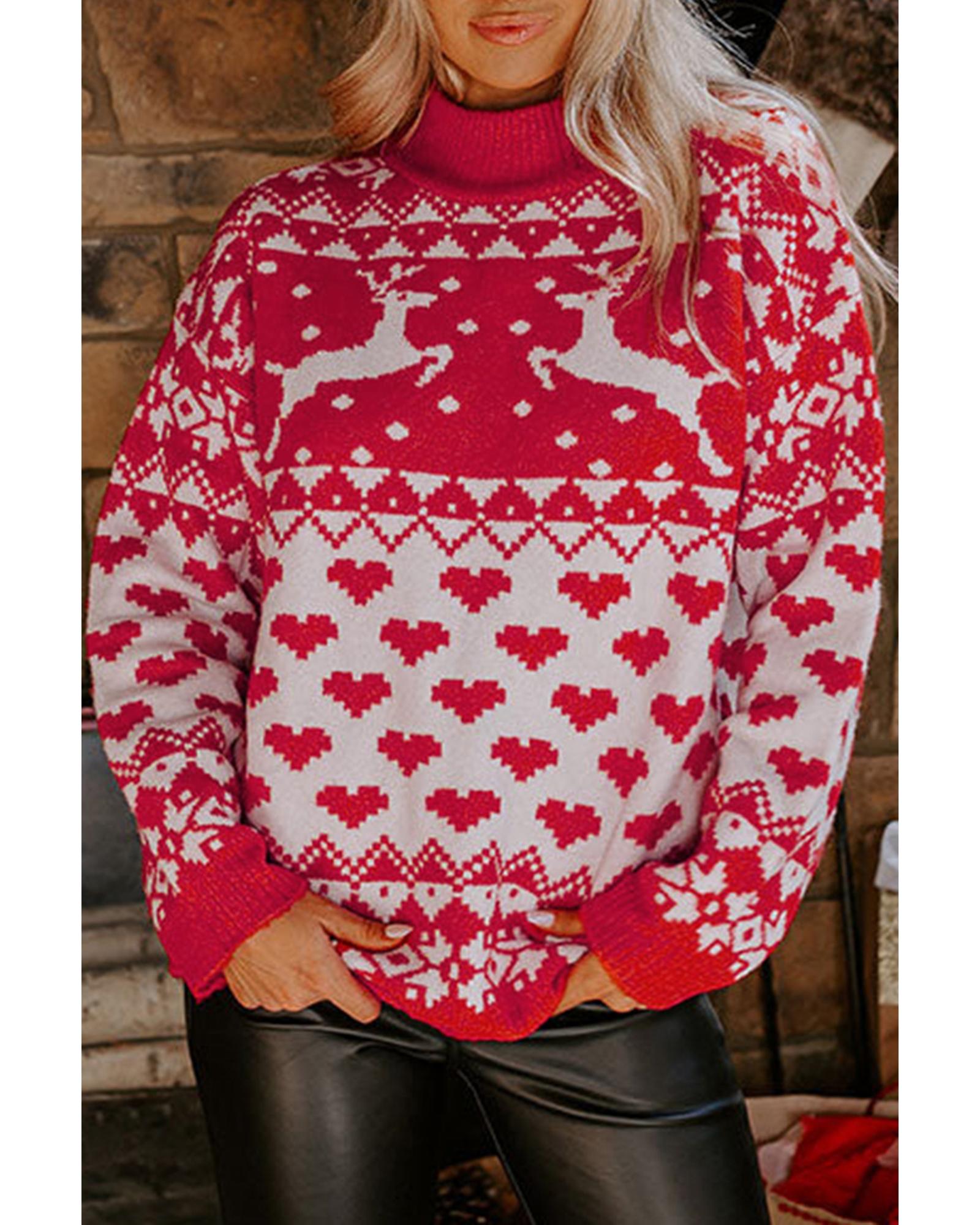 - Fiery Red Merry Christmas Reindeer Heart Pattern High Neck Sweater