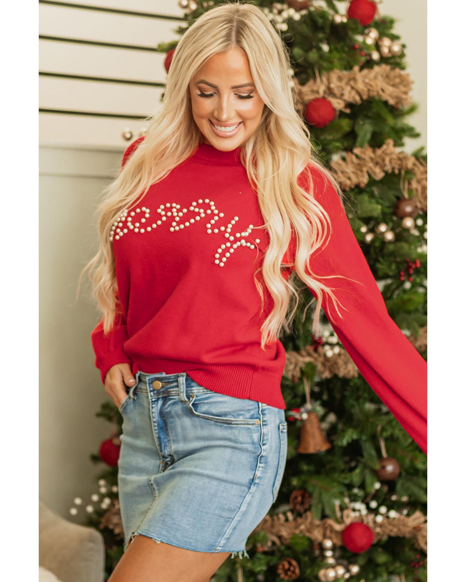 Fiery Red Pearl Beaded Merry Casual Sweater – L
