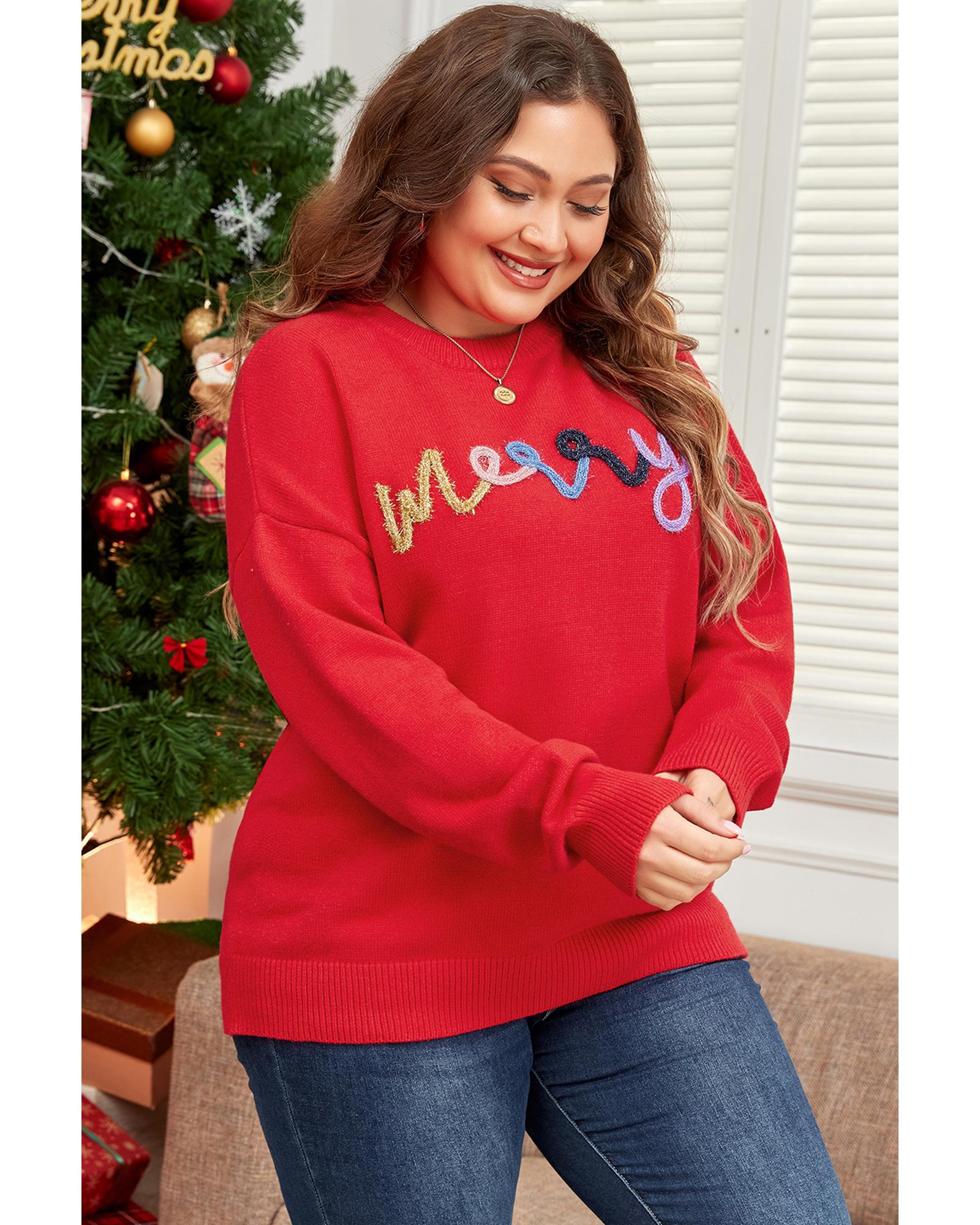 Fiery Red Tinsel merry Pattern Drop Shoulder Plus Size Sweater – 2X