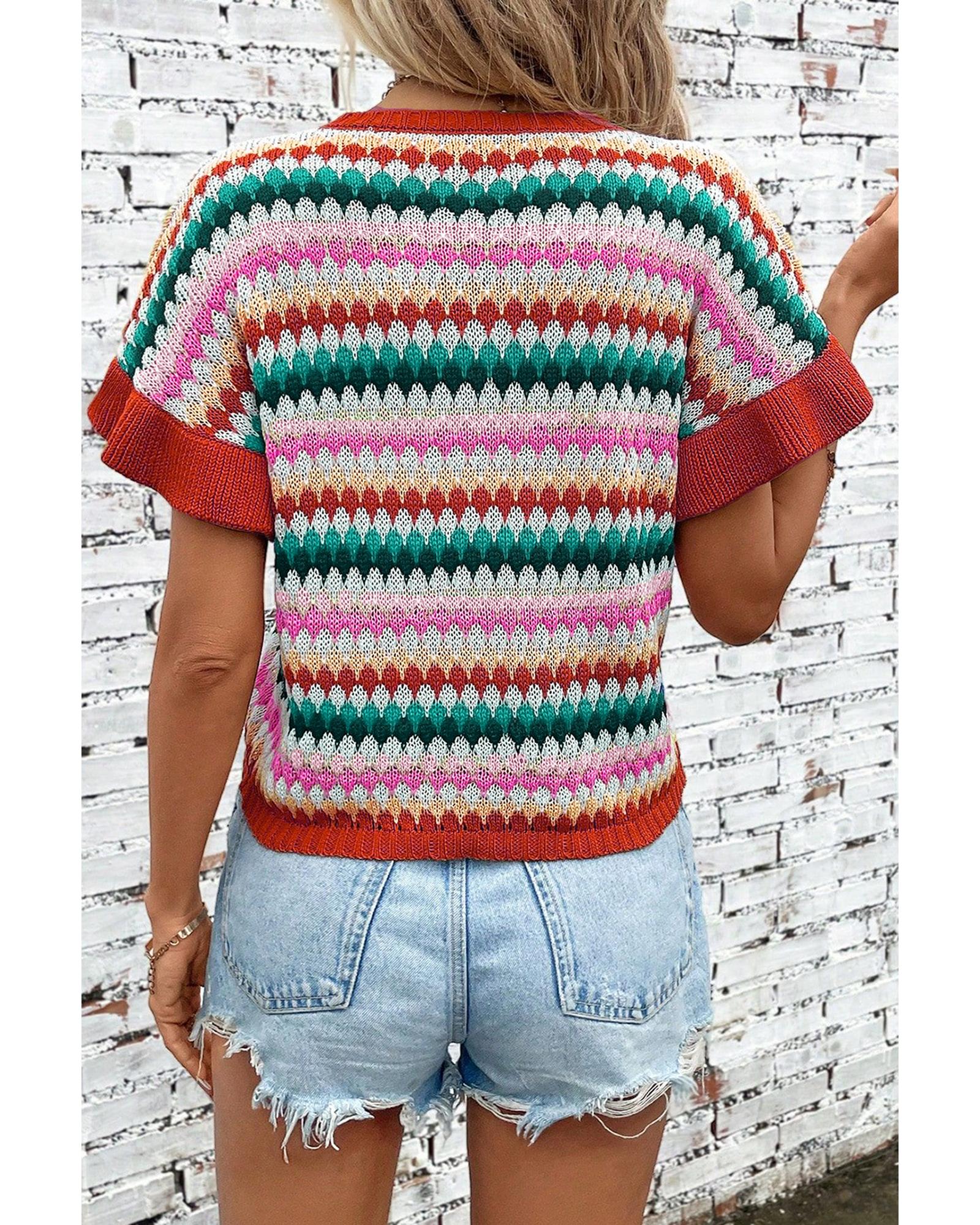 Fiery Red Trimmed Ruffle Sleeve Colorful Textured Sweater – S