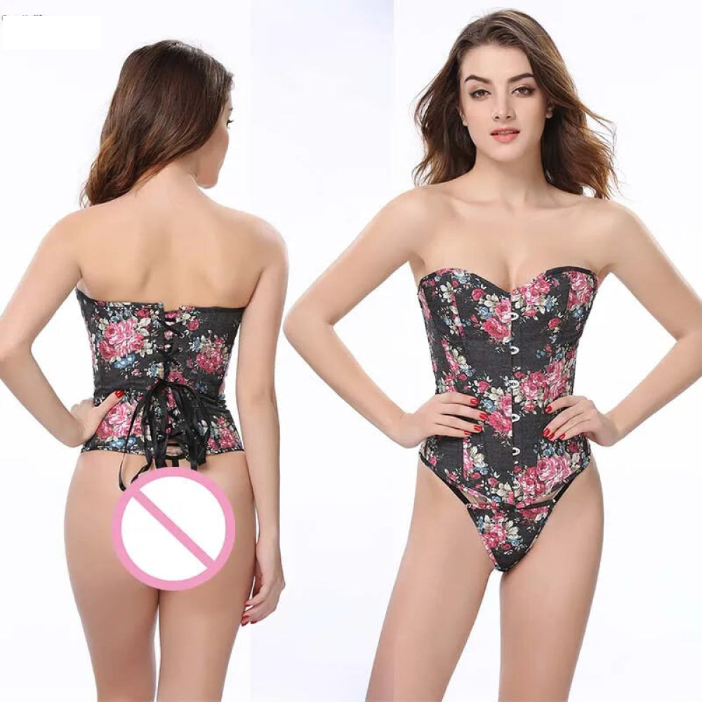 Floral Lace-Up Denim Corset Plus Size S-6Xl Boned Strapless Blue / Black – Black – L