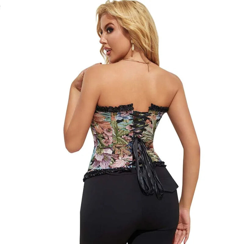 Floral Print Lace Trimmer Boned Strapless Corset Gothic Vintage Style – M