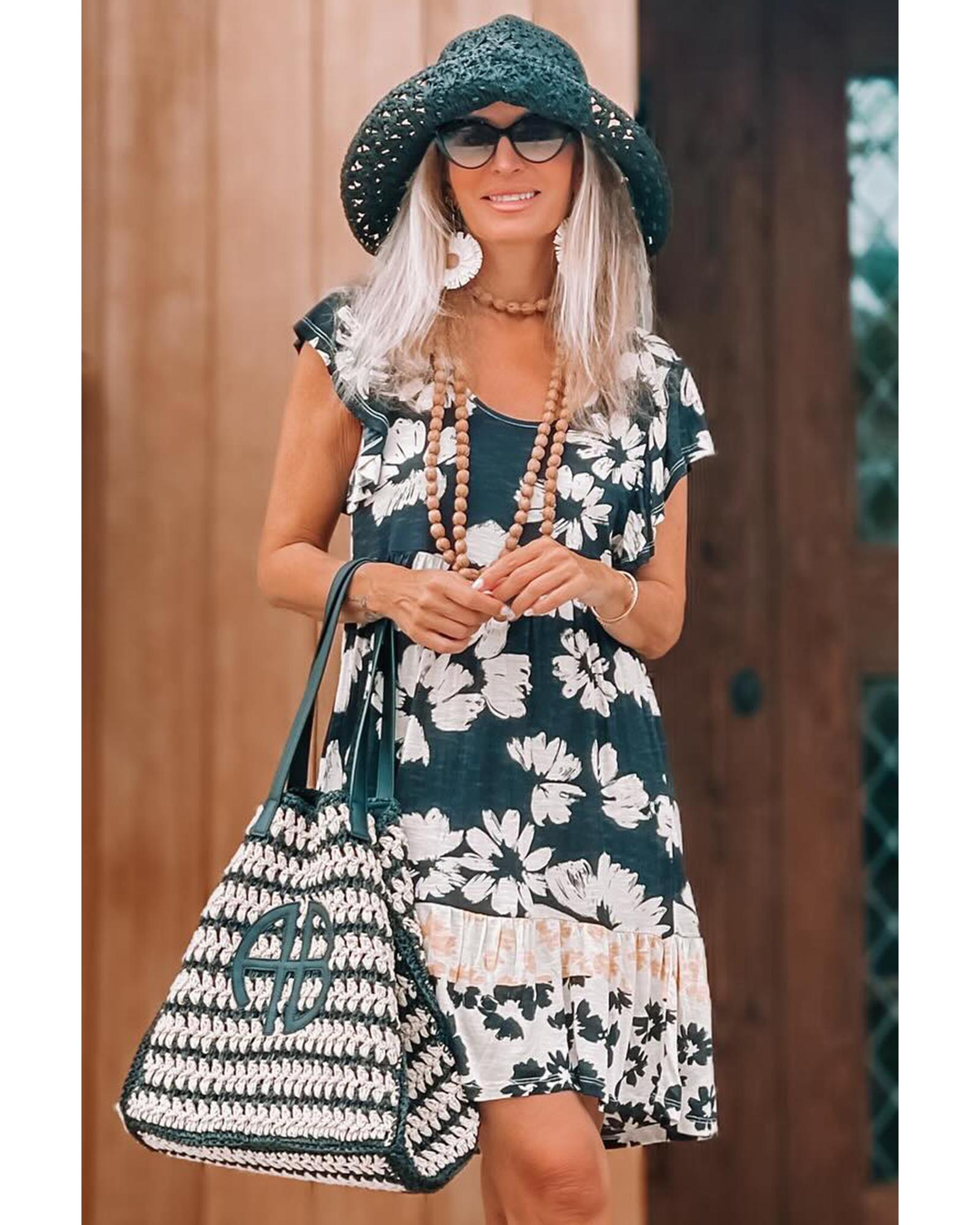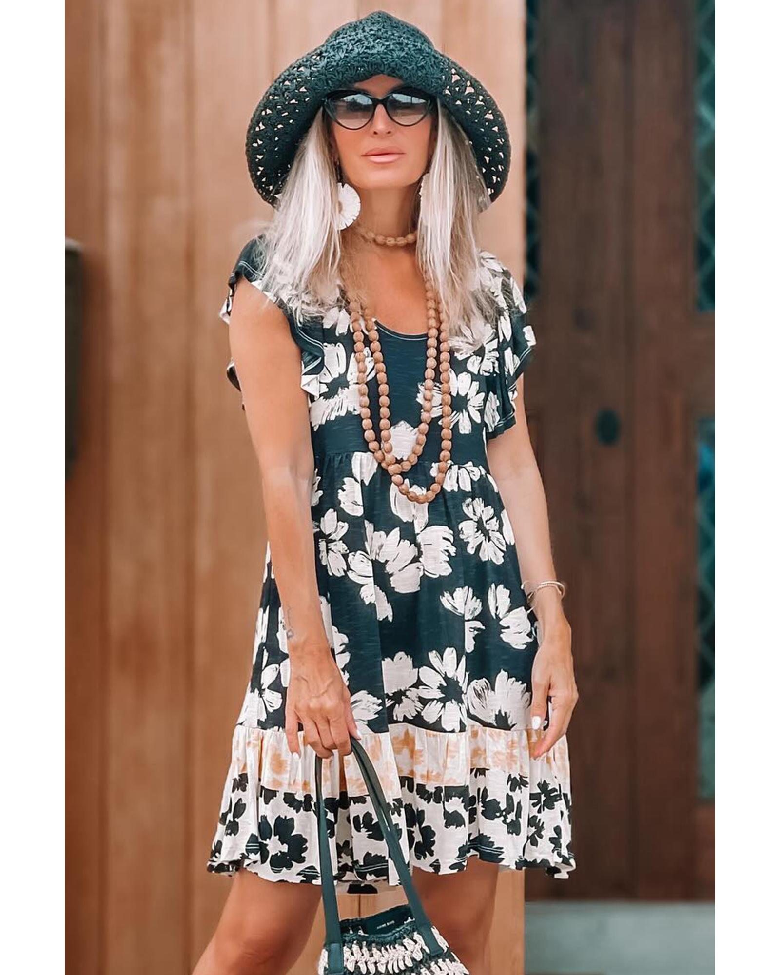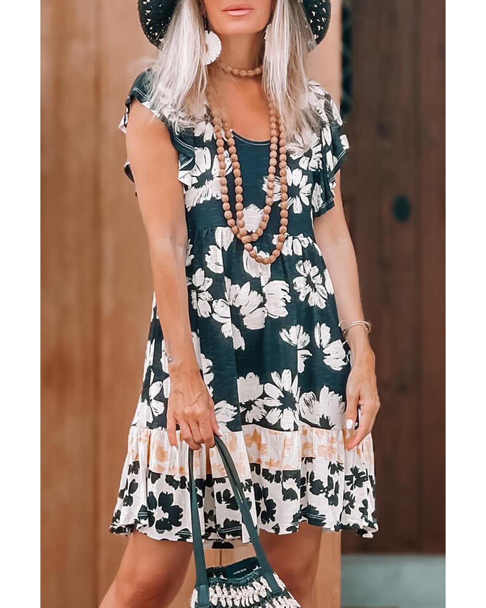 Floral Print Ruffle Sleeve Empire Waist Mini Dress – L