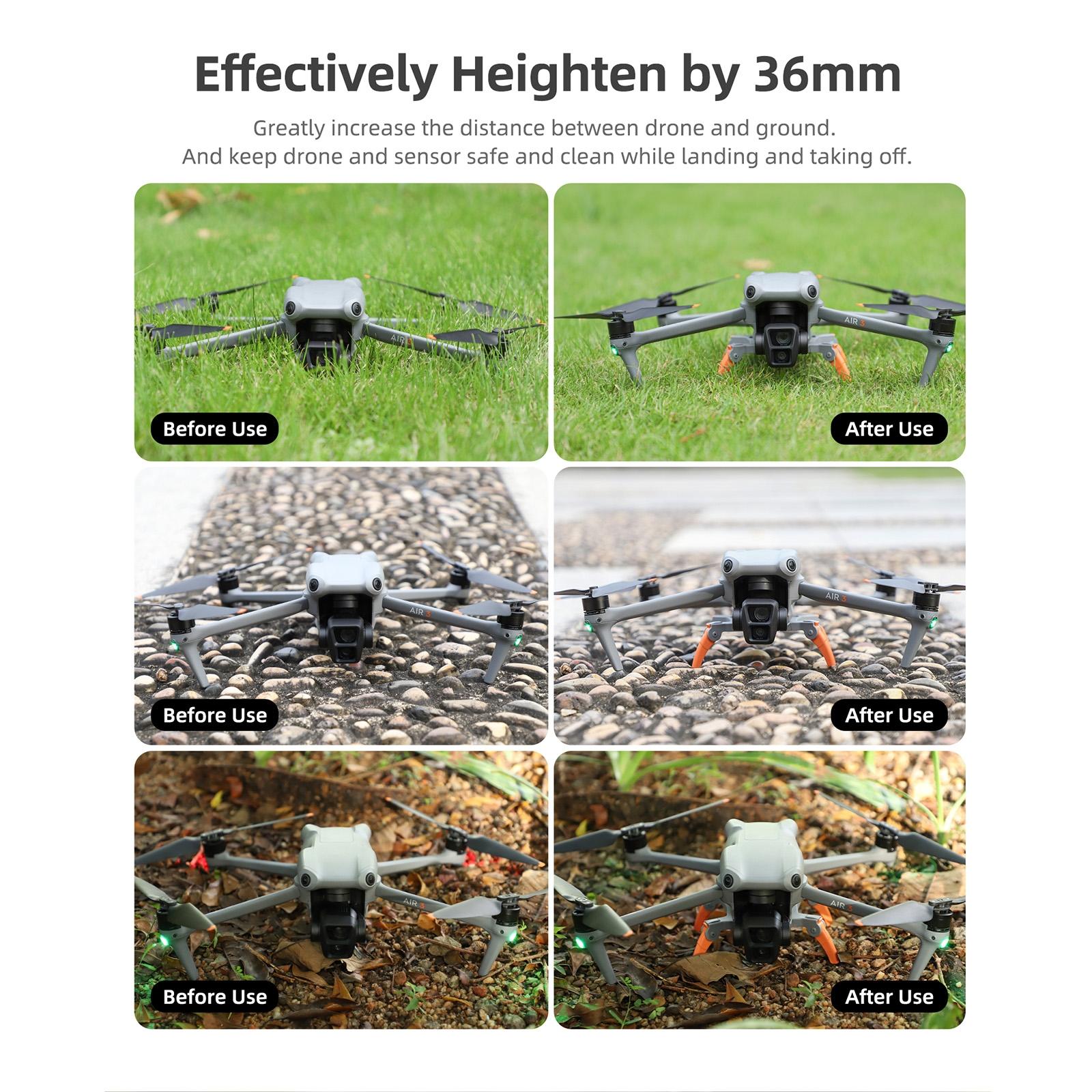 • Effectively increase the height by about 36mm. It greatly increases the distance between the fuselage and the ground, effectively preventing ground debris from damaging or contaminating the fuselage, sensors, etc. during takeoff and landing.