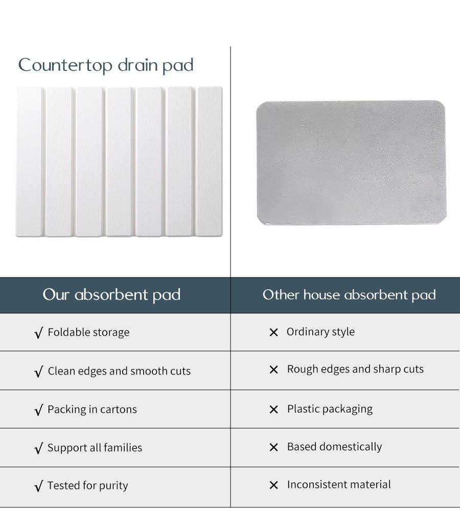 Keep your sink countertop dry and tidy with our innovative Folding Countertop Drain Mat. This mat utilizes fast water absorption technology, capable of absorbing drips in as little as 10 seconds. Made from skin-friendly diatomaceous earth material, it’s designed for quick drying and features a double anti-slip backing for stability. The foldable design allows for convenient storage, and its clean edges and smooth cuts offer a superior finish. With a thickness of 9mm, it provides a sturdy and absorbent surface for drying dishes, glasses, or kitchen tools. This absorbent pad is easy to clean and supports all families with its universal application. Packaged in a carton for better protection.