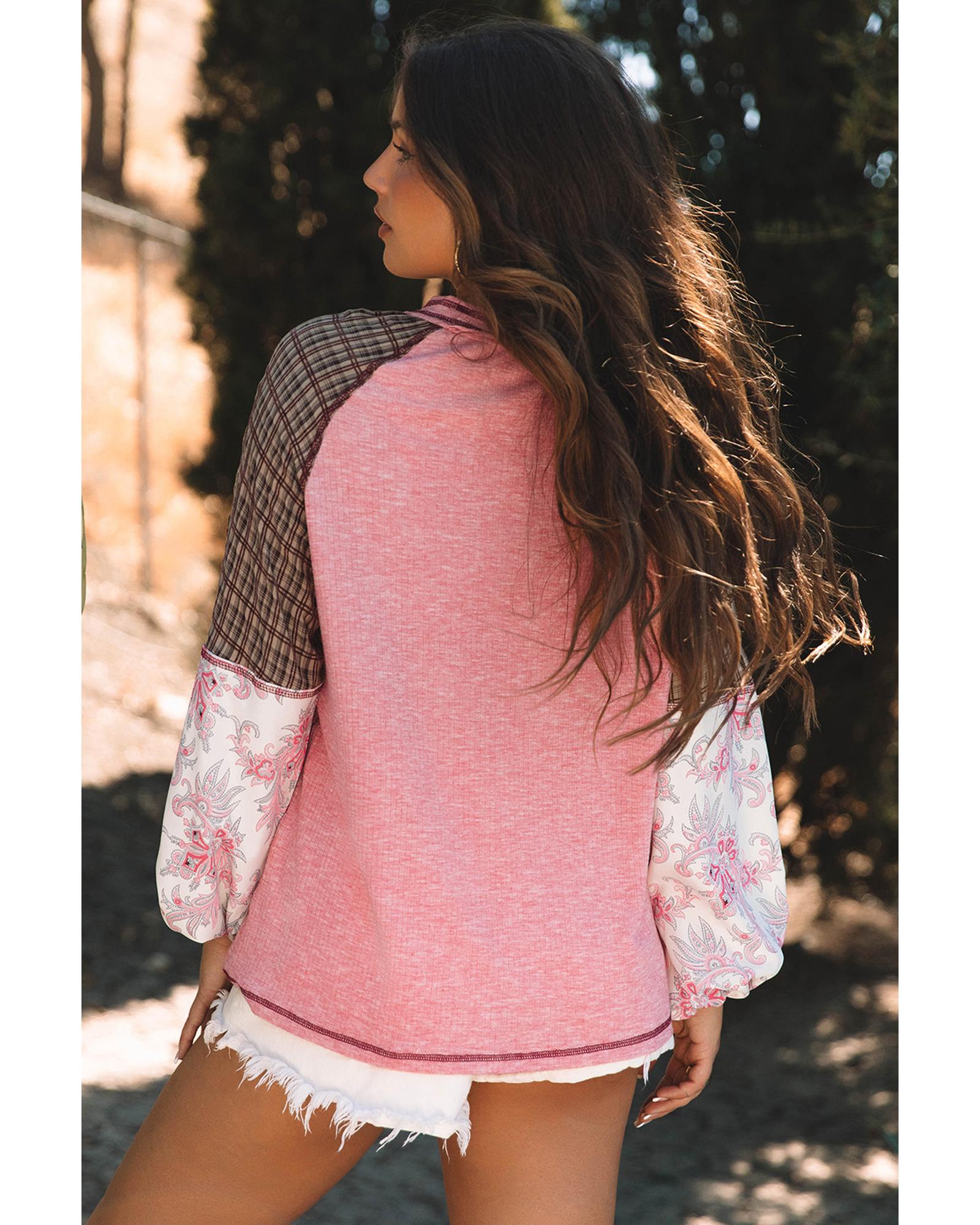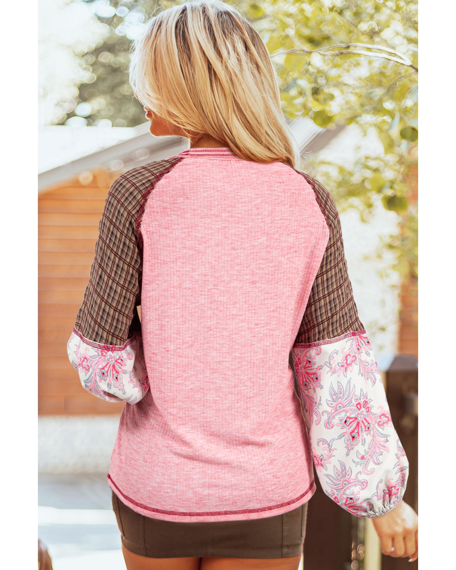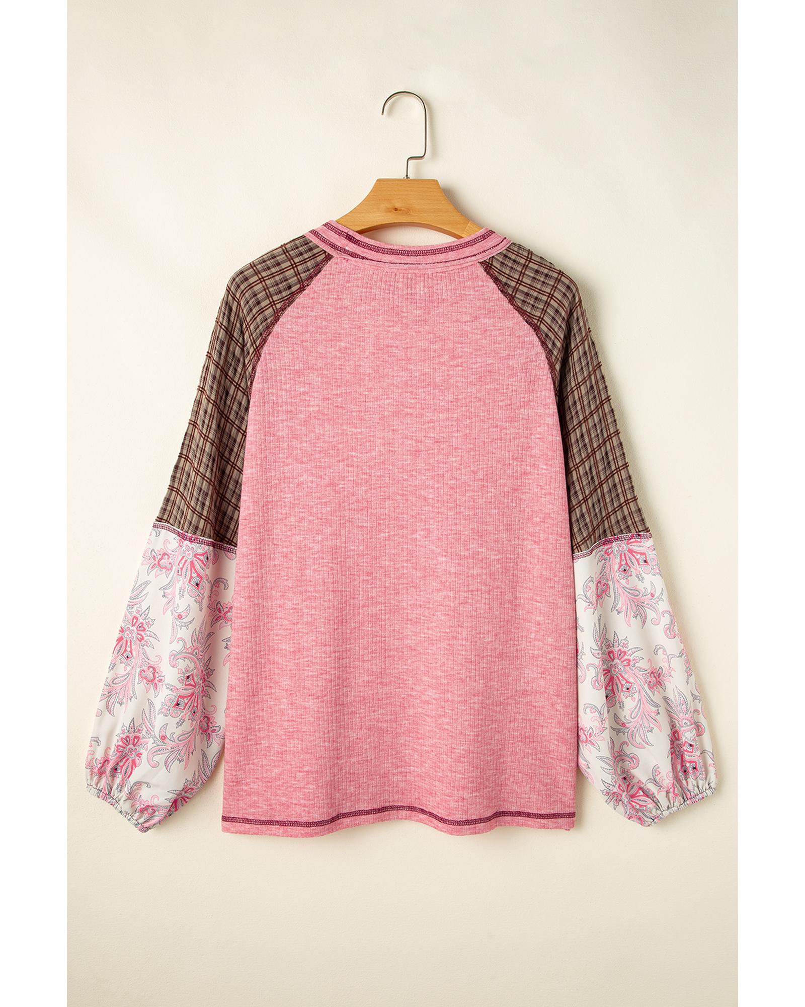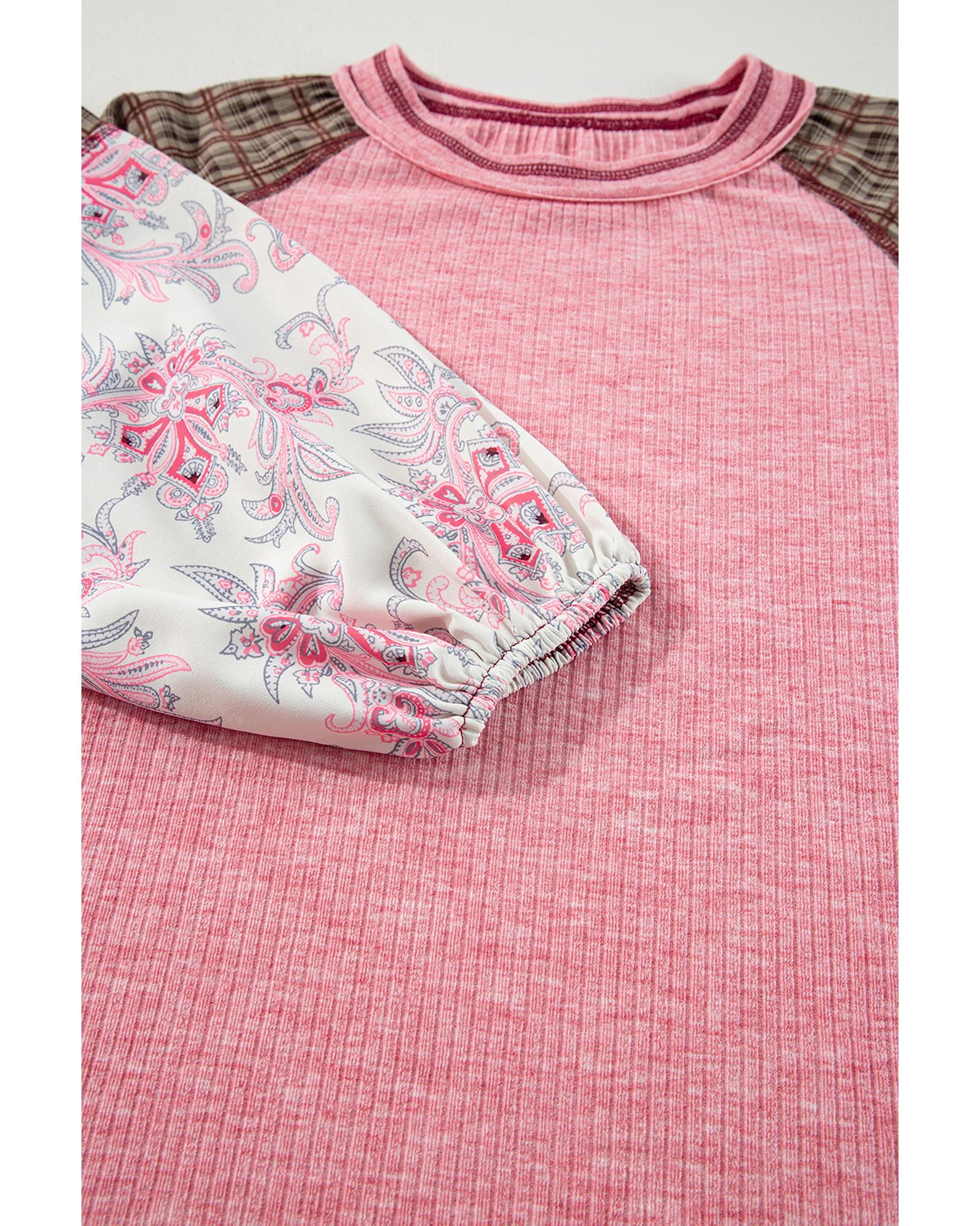 Fushia Mixed Print Raglan Sleeve Ribbed Knit Patchwork Blouse – S