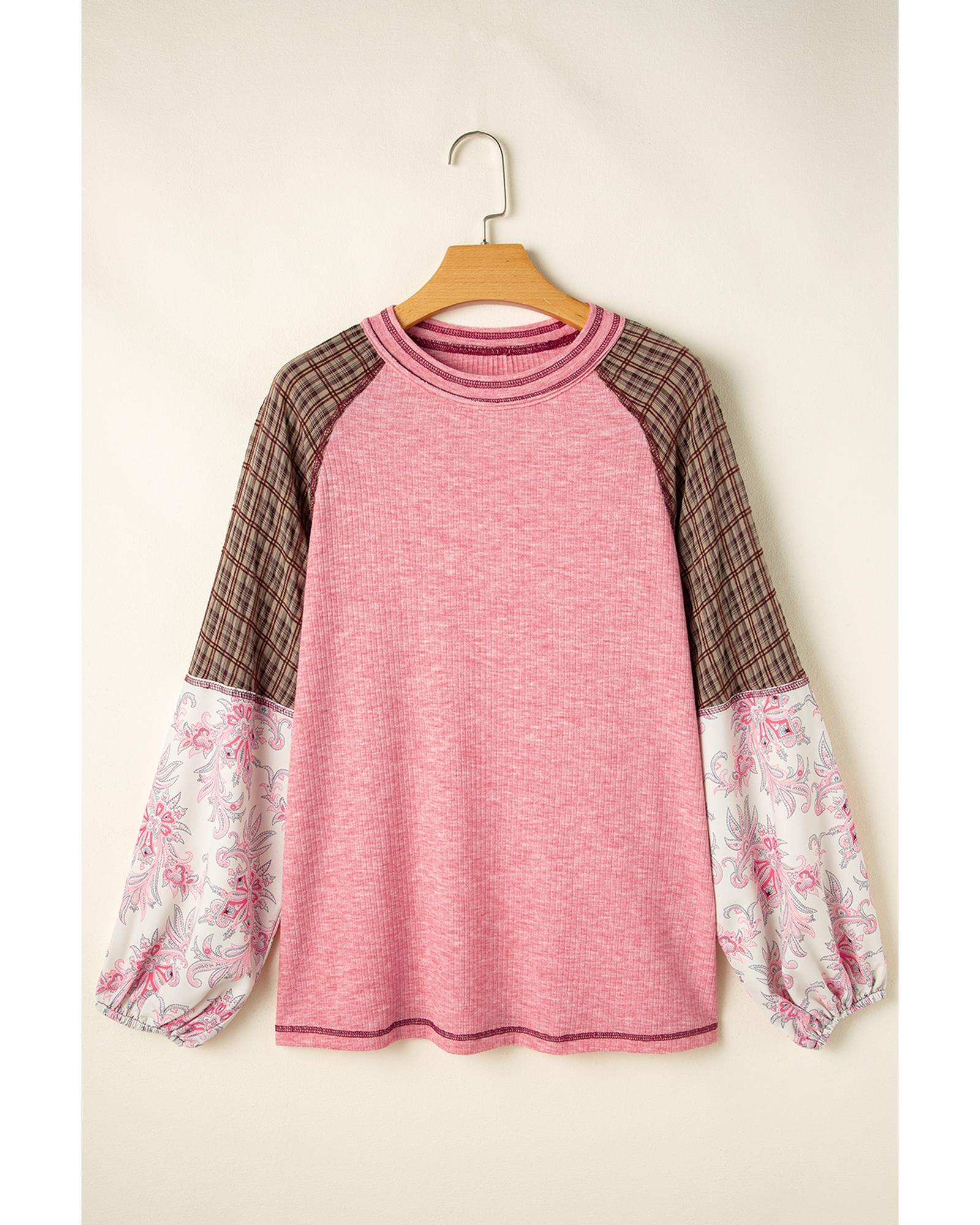 Fushia Mixed Print Raglan Sleeve Ribbed Knit Patchwork Blouse – XL