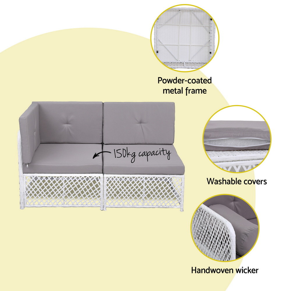 This 4-seater set comprises of two corner sofas, one single sofa, an ottoman and a matching centre table. You can arrange them in multiple ways to suit your space. Its beautiful and versatile design makes it perfect for both indoor and outdoor use. All the seat and back cushions come with thickness padding that ensures your comfort always. Additionally, our outdoor chairs features a lovely handwoven rattan weave for a touch of tropical charm and decorative effect, and the UV-resistant PE wicker makes this lounge set perfect for all-weather use. The large table with 5mm thick tempered glass top, and durable powder-coated frame ensures strength and durability. You can create a praise-worthy spot with just a little creativity that will wow your guests. Shop it for your home today.