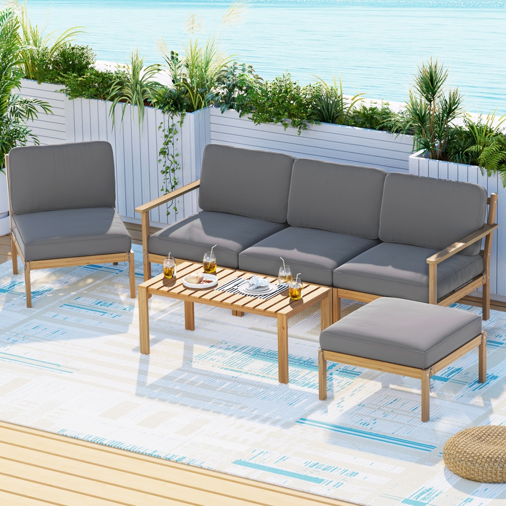 Get outdoors just in time for summer with the Gardeon 5-seater Outdoor Sofa Set. Featuring single sofa, armed sofa, a wide coffee table and an ottoman, there’s plenty of space for the whole family. The conversation sofa set is easy to assemble, and you can easily configure the seating into your perfect outdoor set-up. The set uses solid wood, while the outdoor cushions feature water-resistant, UV-resistant covers, and a thick high-density foam core for comfort. The tabletop’s slatted design easily drains during wet weather and has plenty of room to hold your outdoor essentials. Maintenance is as easy as wiping down the furniture, and you can remove the cushion covers for even easier cleaning. So what are you waiting for? Make the most out of the beautiful weather with a Gardeon 5-seater Outdoor Sofa Set.