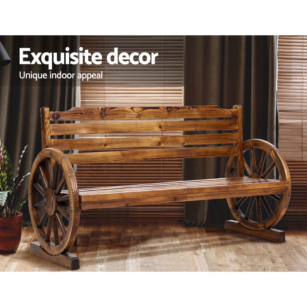 Time to have a seat on the wild wild west side. That is right, our Gardeon Wagon Wheel Bench definitely looks the part to spice up your garden and backyard with some country soul. From its period styling to its rustic imported Canadian Fir wood design, the bench is solidly built to seat three people comfortably. The attention to detail is excellent with finely crafted wagon-wheel armrests, a smooth and supportive backrest and exceptional strength and beautiful grains from the Fir wood finish. In fact, the bench can take on a massive weight of up to 300kg. Better still, the Fir wood is weather-resistant, UV-resistant and blessed with a natural resistance to rot and pests. Everything you want in a durable and longlasting garden bench under the great Australian sun and rain. Overall, the bench is given a burnt wood appearance that not only enhances its appearance but also gives it a worn-in style that exudes lots of historic vibes. Our Wagon Wheel Bench should be riding high on your shortlist of garden bench purchase, so rein one in today.
